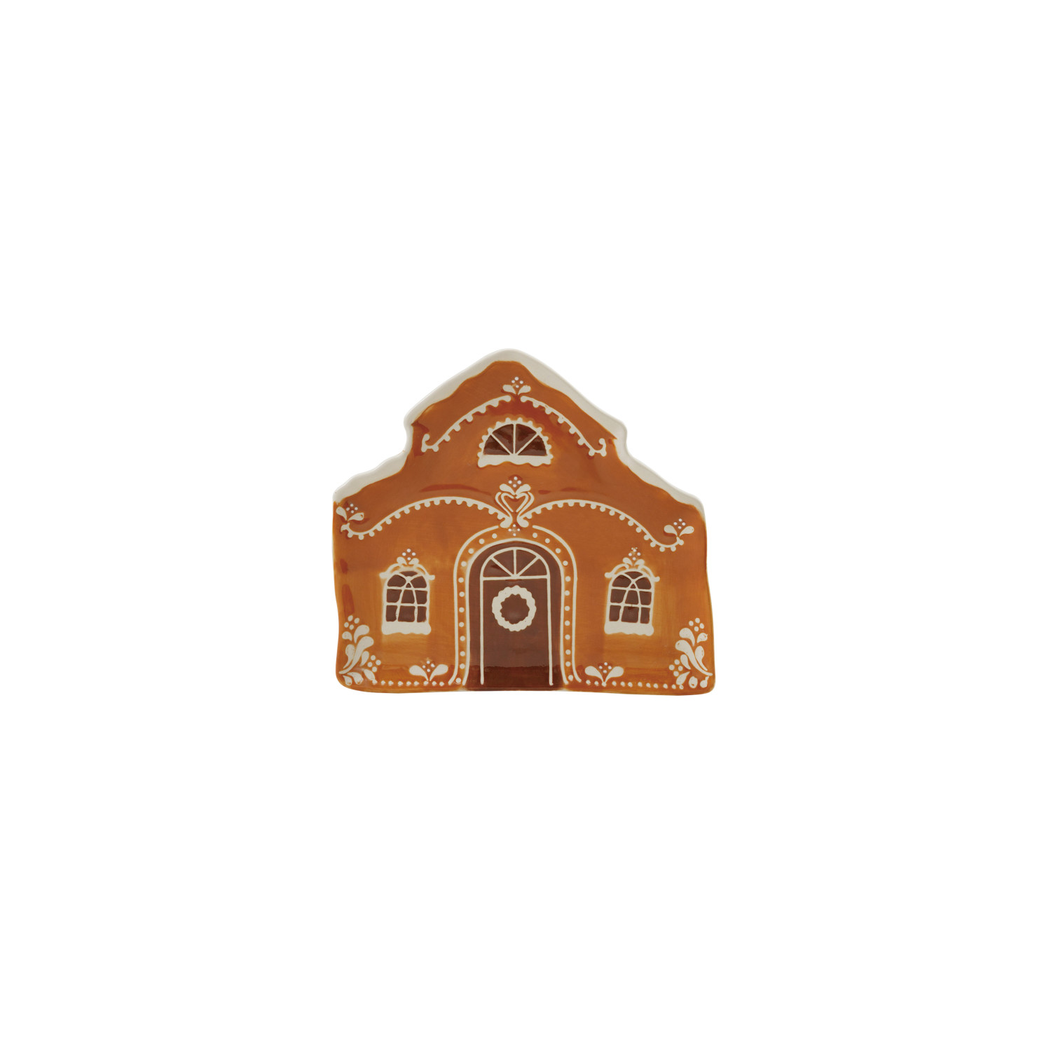 Catalog Name: 7"L x 6"W Hand-Painted Stoneware House Shaped Plate w/ Wax Relief Gingerbread Design, Brown & White
