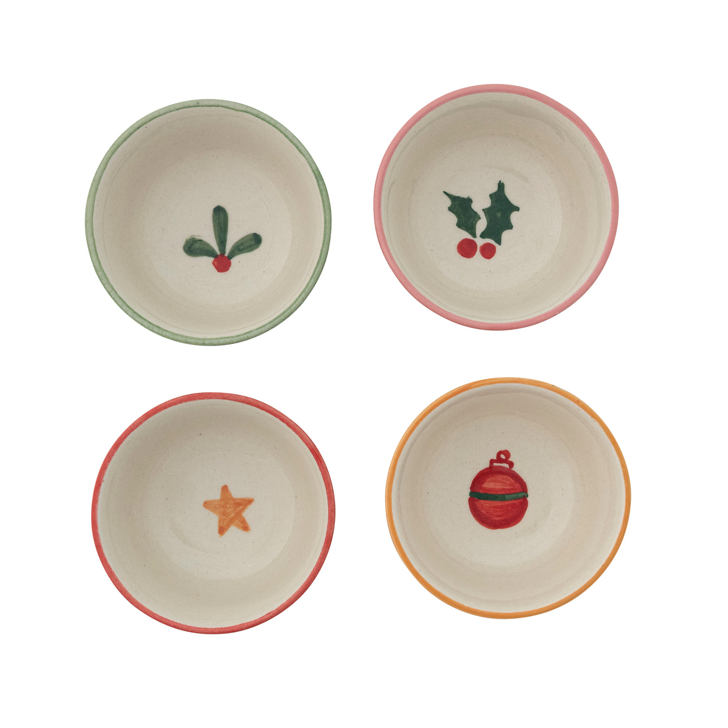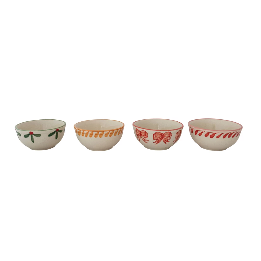 Catalog Name: 4-1/4" Round x 2"H Hand-Painted Stoneware Bowl w/ Patterned Rim & Holiday Image Inside, Multi Color, 4 Styles (Each One Will Vary)