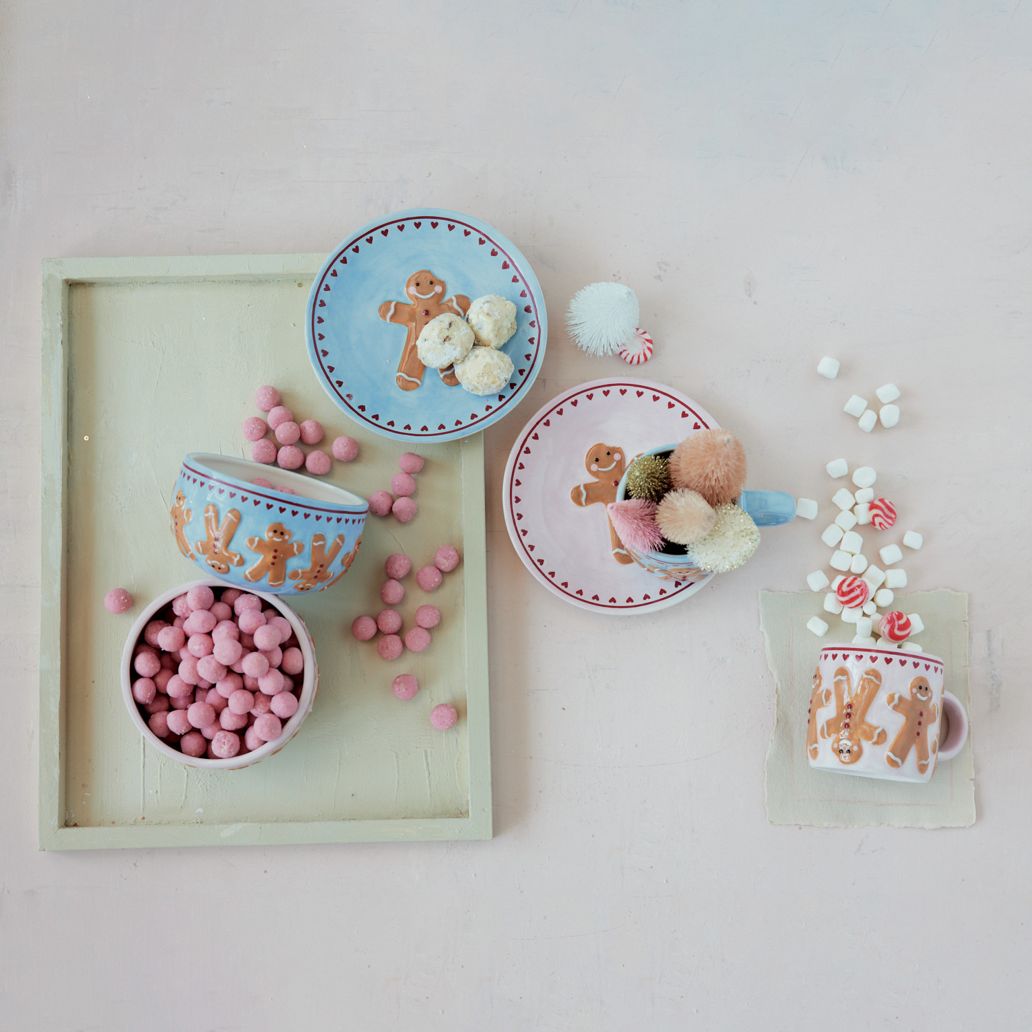 Hand-Painted Stoneware Bowl with Wax Relief Gingerbread Pattern & Hearts, 2 Colors