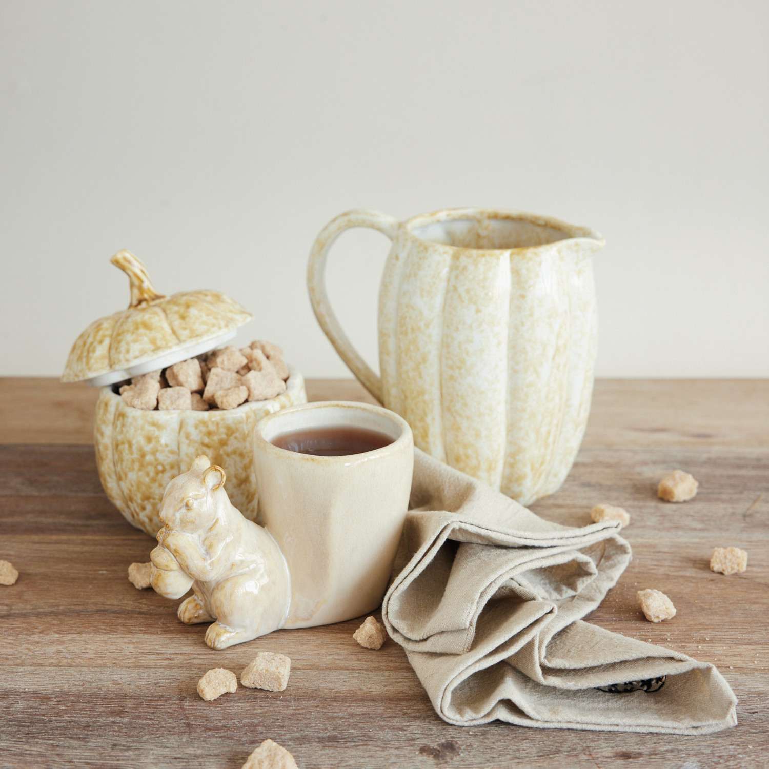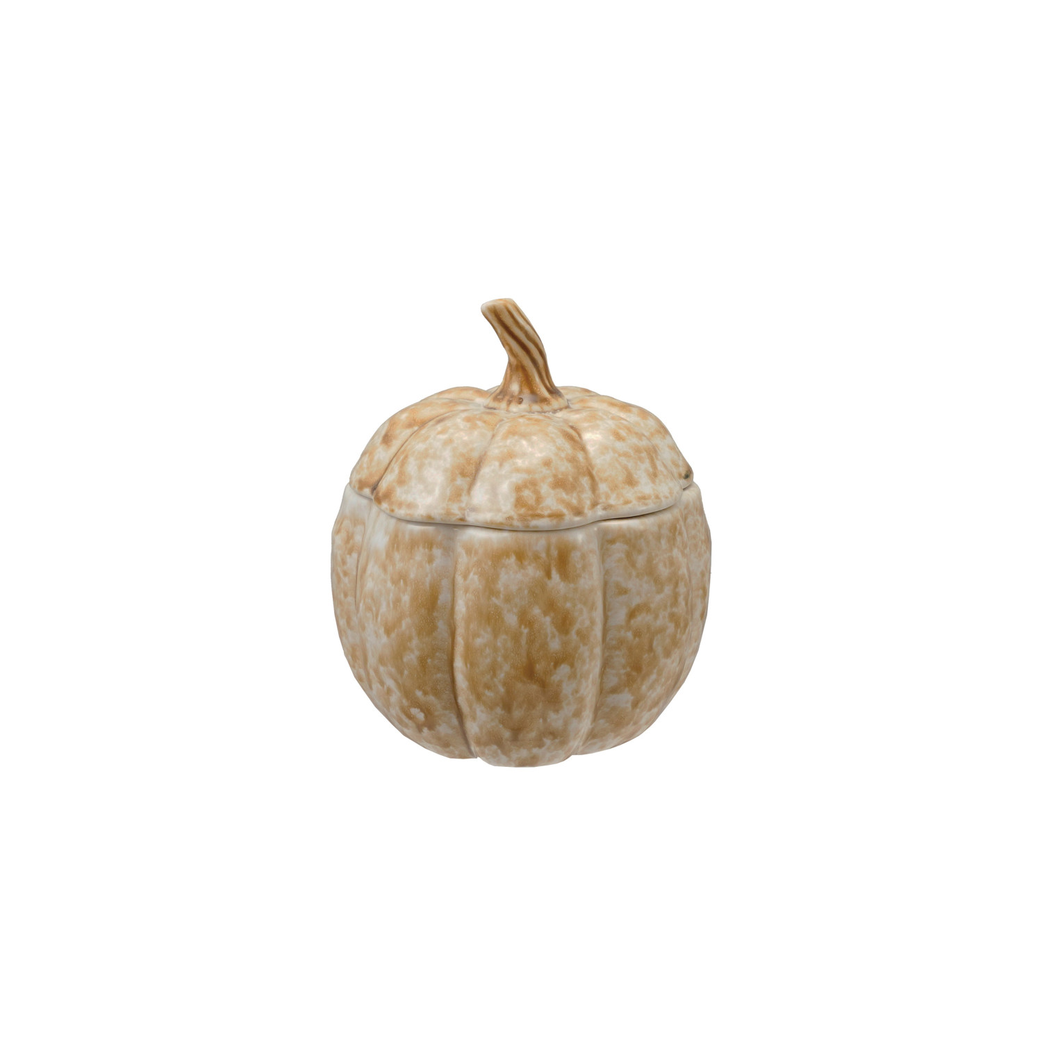 Catalog Name: 5" Round x 6"H Stoneware Pumpkin Shaped Jar w/ Lid, Reactive Glaze, Cream Color (Each One Will Vary)