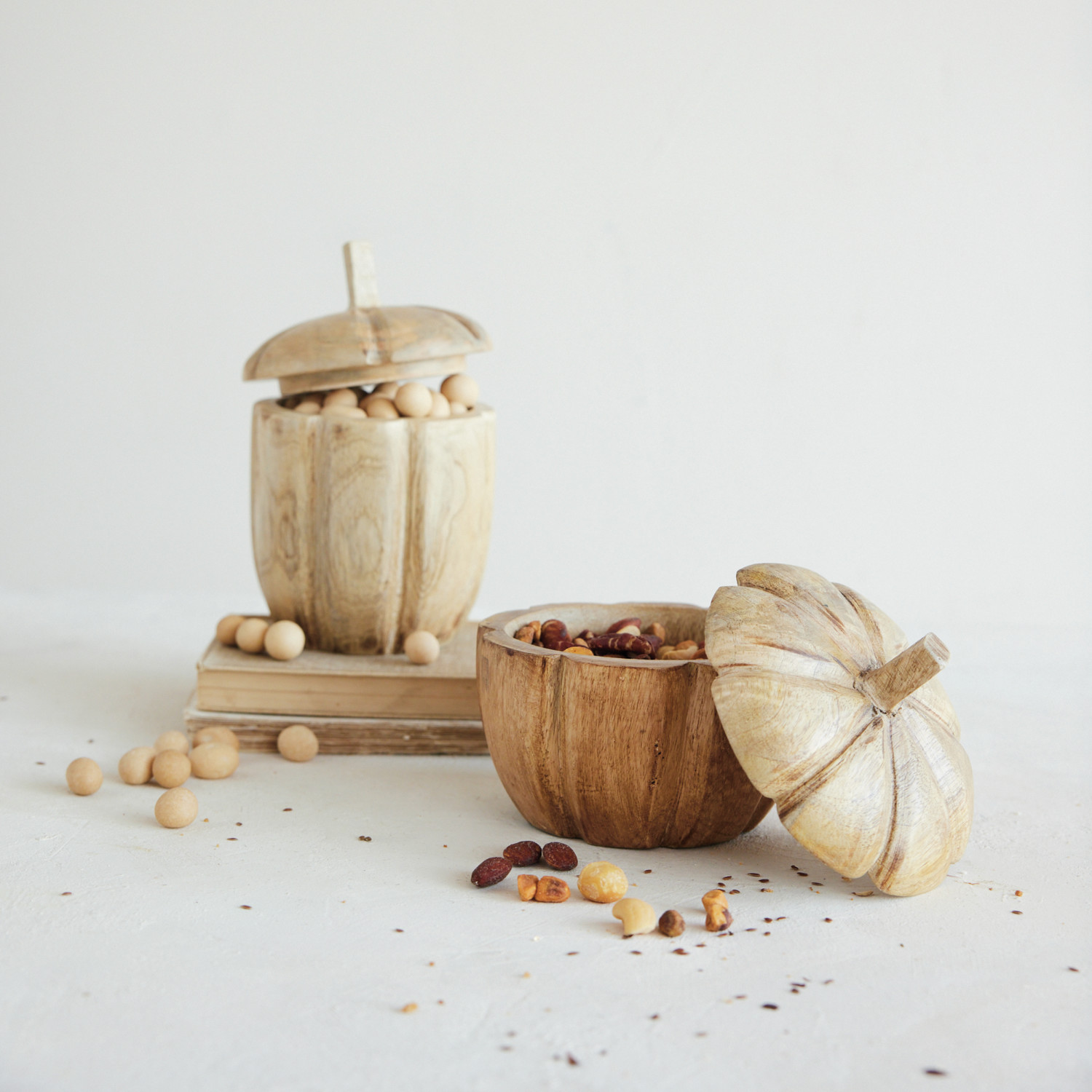 Hand-Carved Mango Wood Pumpkin Shaped Container with Lid, Natural