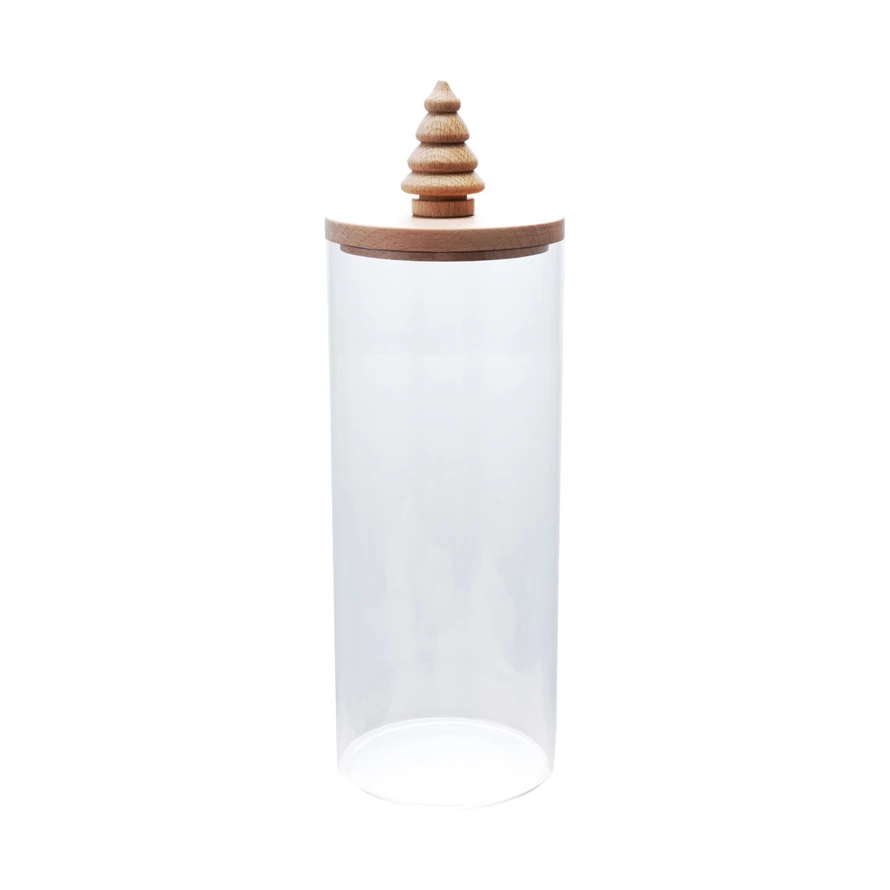 4" Round x 12"H Glass Canister with Wood Lid & Christmas Tree Knob