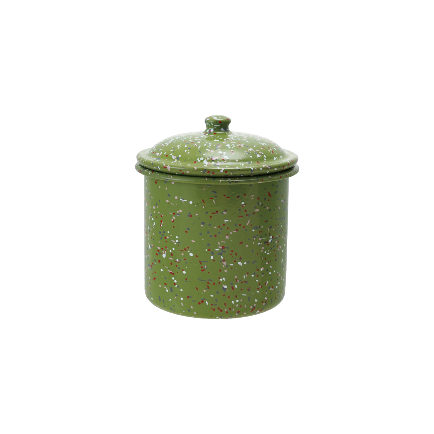 Catalog Name: 5" Round x 5"H Enameled Metal Splatterware Jar w/ Lid, Green