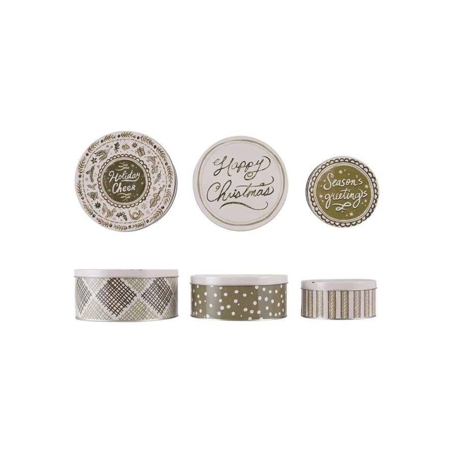Catalog Name: 8" Round x 3-1/2"H, 7-1/4" Round x 3"H & 5-1/2" Round x 2-1/2"H Embossed Tins w/ Lids, Holiday Patterns & Sayings, Green & Cream Color, Set of 3 ©