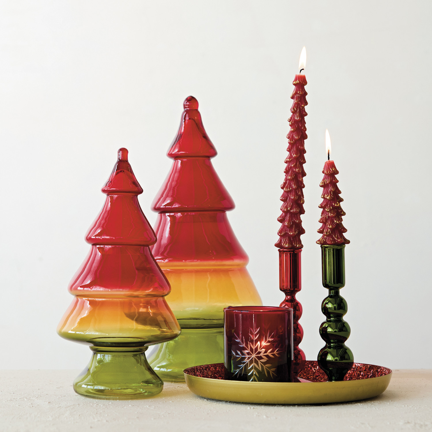 Catalog Name: 6" Round x 12"H Hand-Blown Glass Tree Shaped Jar w/ Lid, Red, Yellow & Green