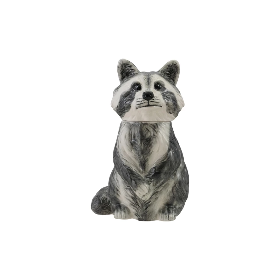 Hand-Painted Stoneware Raccoon Shaped Cookie Jar, Black, Grey & White ©