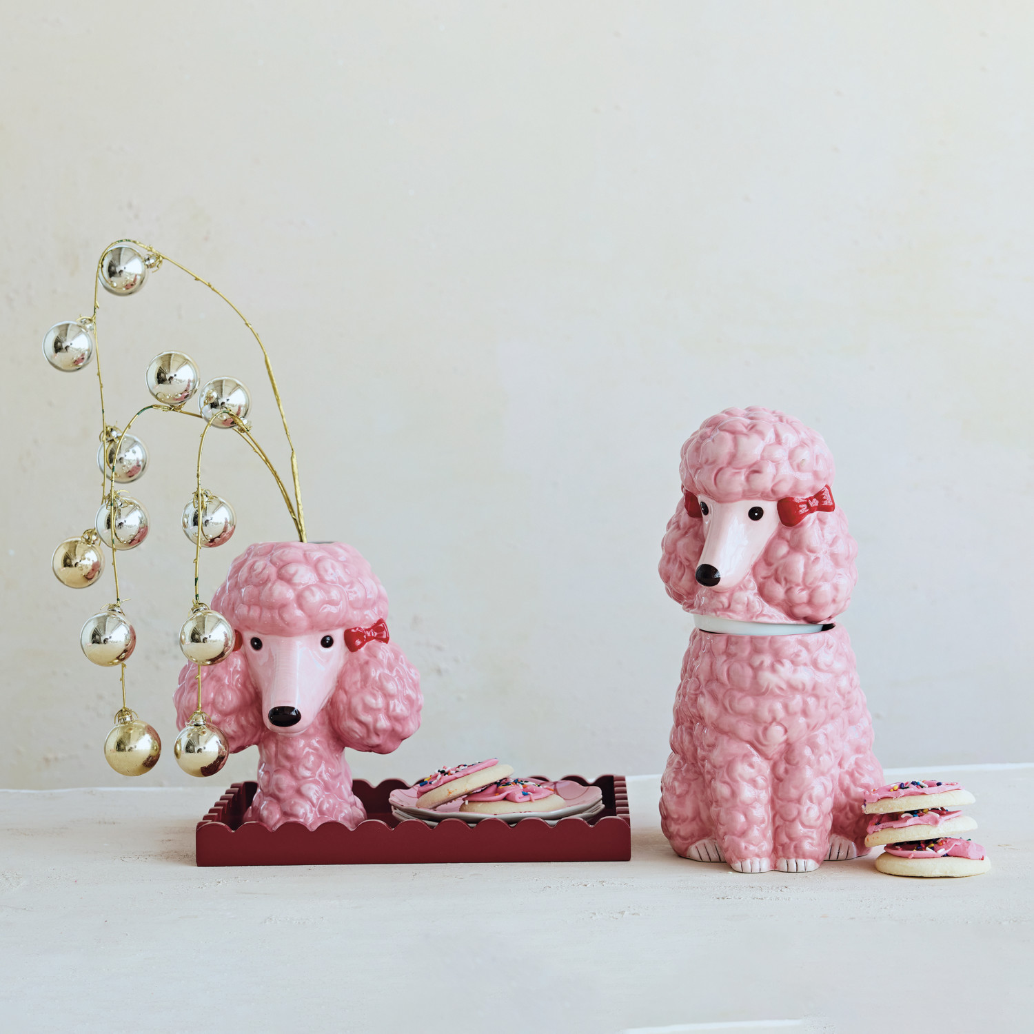 Ceramic Poodle Shaped Cookie Jar with Bows, Pink, Red & Black