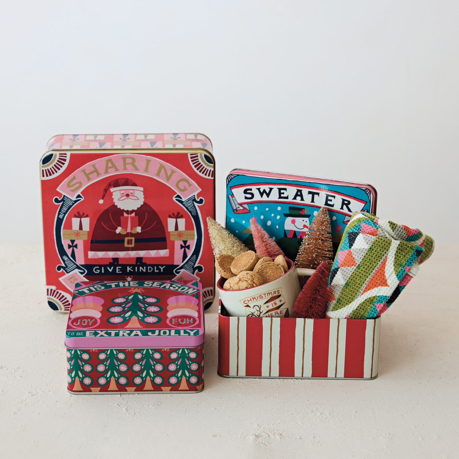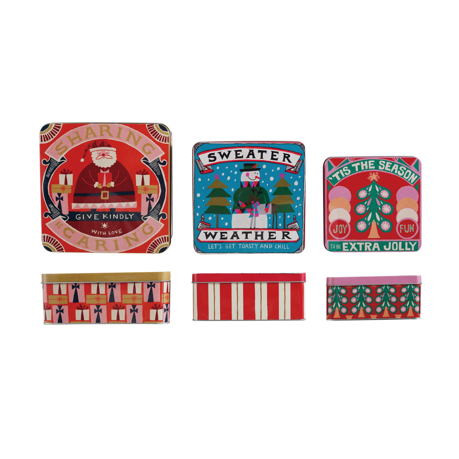 Catalog Name: 8-1/4" Square x 3-1/4"H, 7" Square x 3"H & 6" Square x 2-3/4"H Embossed Tins w/ Lids, Holiday Images & Sayings, Multi Color, Set of 3 ©
