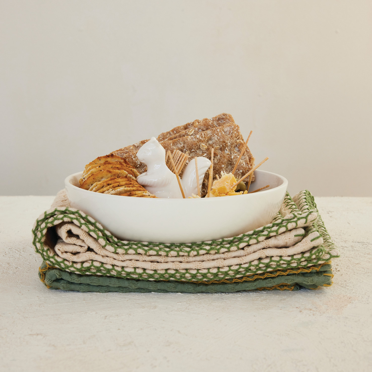 Stoneware Bowl with Squirrel Shaped Toothpick Holder, White
