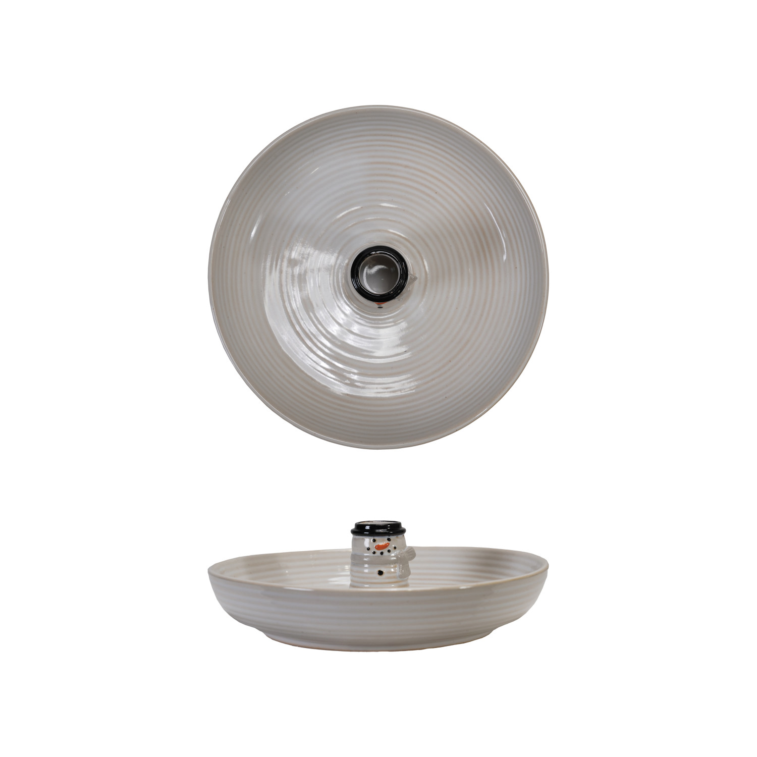 Catalog Name: 8-1/2" Round x 2-3/4"H Stoneware Ribbed Bowl w/ Snowman Shaped Toothpick Holder Inside, Reactive Glaze, White & Black (Each One Will Vary)