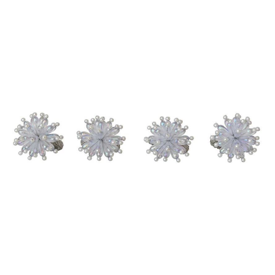 Catalog Name: 1-3/4" Round x 3"H Handmade Glass Beaded Metal Snowflake Napkin Rings, Iridescent Finish, Set of 4