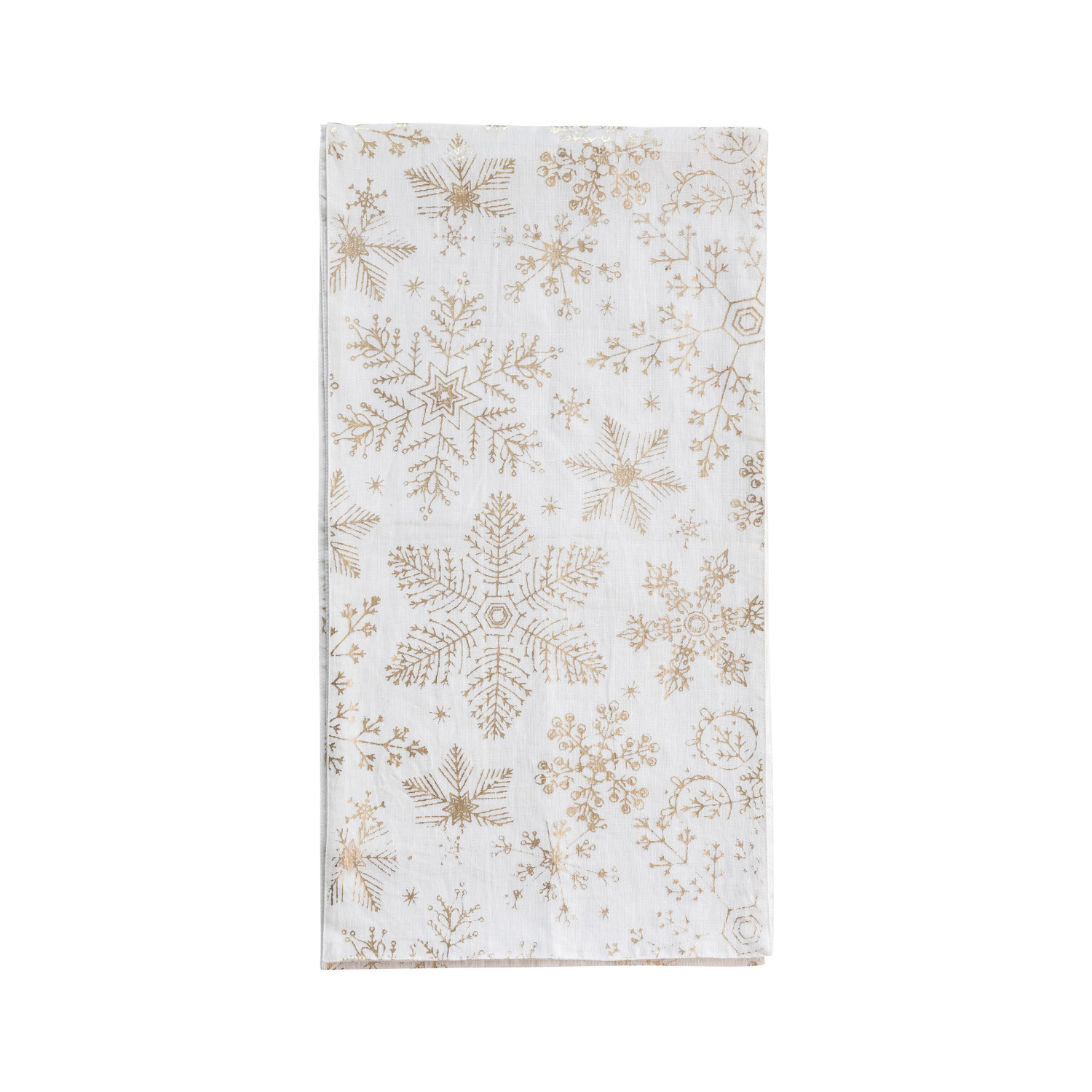 Add some sparkle and elegance to the dining table with this linen and cotton-printed table runner with a gold foil snowflake pattern in white. This table runner is a festive and glamorous piece that features a white background and a gold foil snowflake pattern, creating a stunning and elegant display. The table runner is suitable for any occasion, whether it is a casual family meal, a festive holiday celebration, or a special event. The table runner is made of a blend of linen and cotton, which makes it soft, smooth, durable, and easy to care for. The table runner measures 108 inches in length and 14 inches in width, making it a great fit for most tables. Transform any table into a stylish display with this versatile and functional table runner. A linen and cotton printed table runner with a white background and a gold foil snowflake pattern. A festive and glamorous piece that can add some sparkle and elegance to the dining table. This table runner is suitable for any occasion, whether it is a casual family meal, a festive holiday celebration, or a special event.