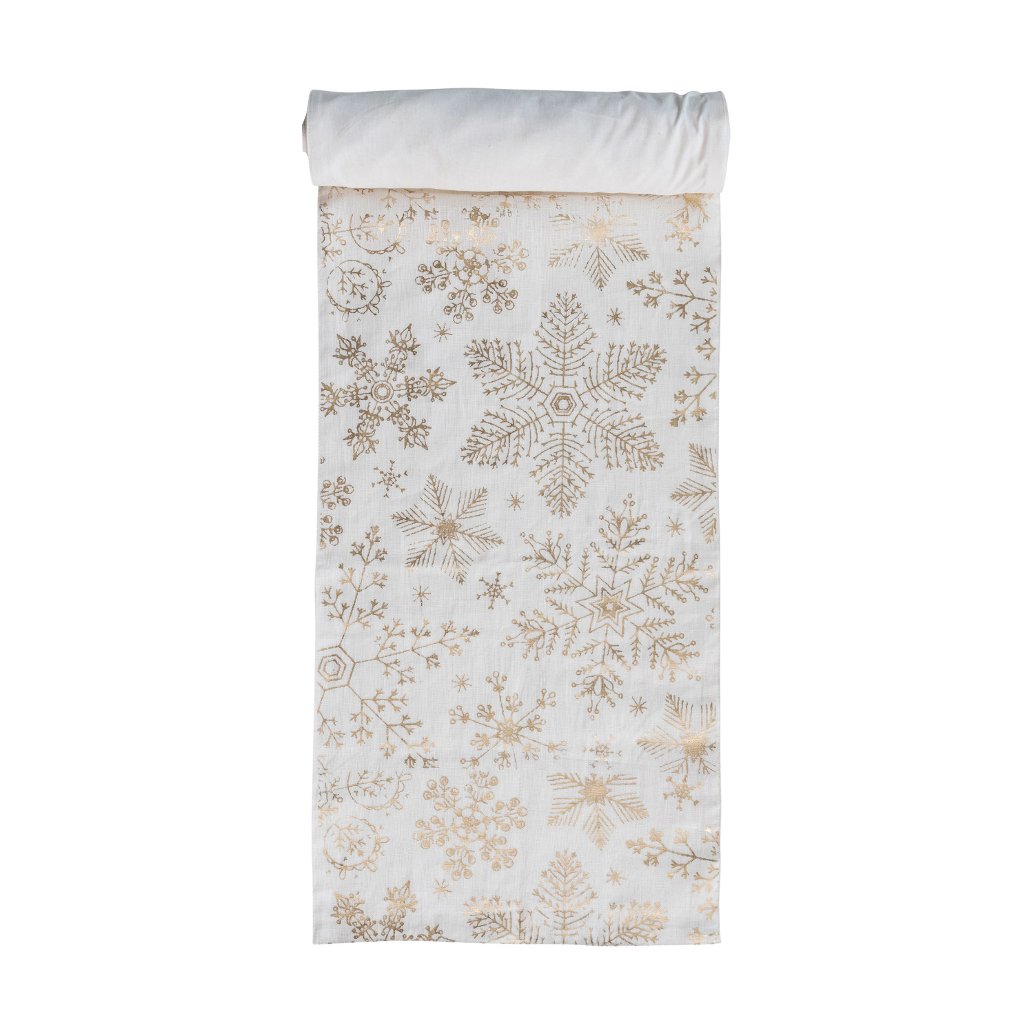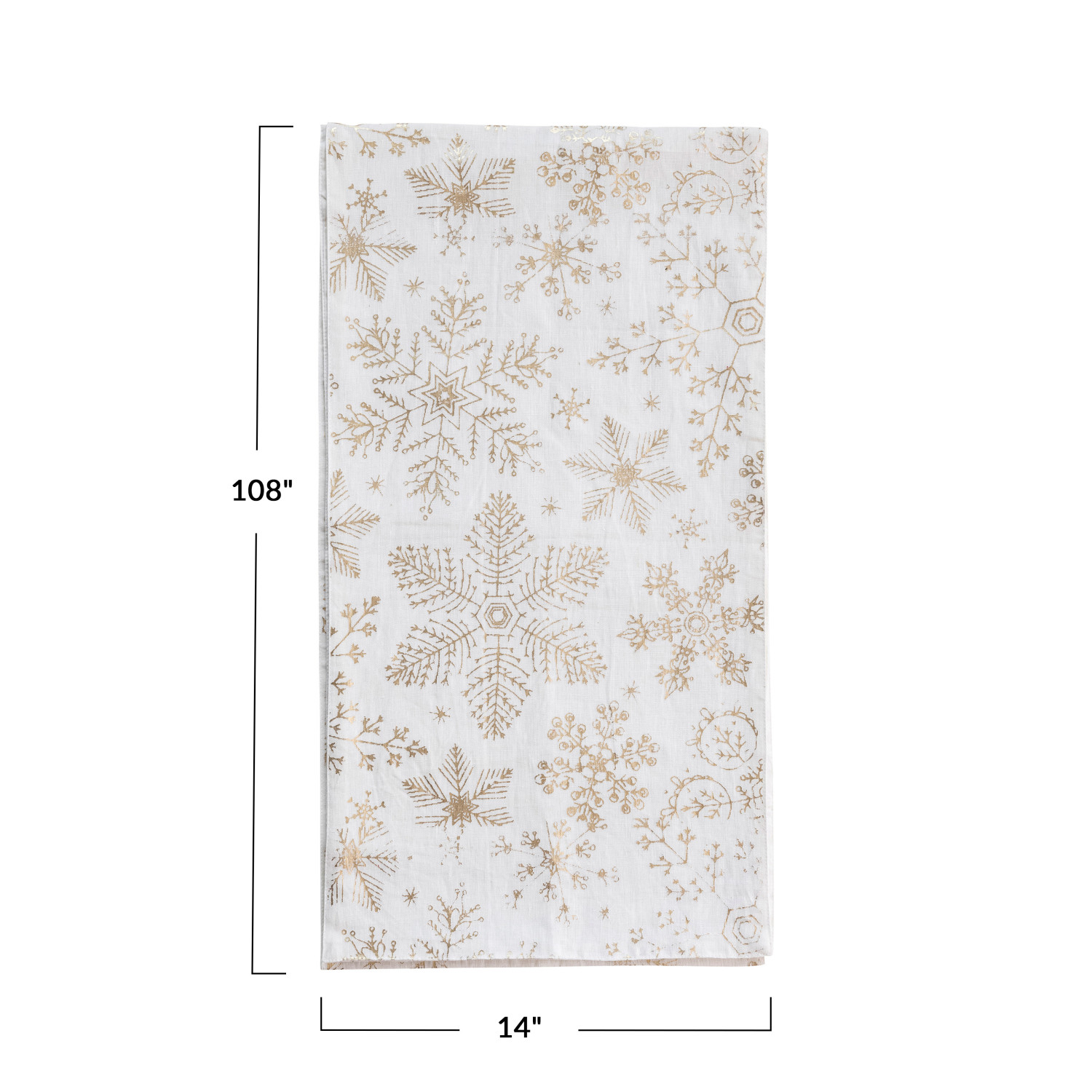 Catalog Name: 108"L x 14"W Linen & Cotton Printed Table Runner w/ Gold Foil Snowflake Pattern, White