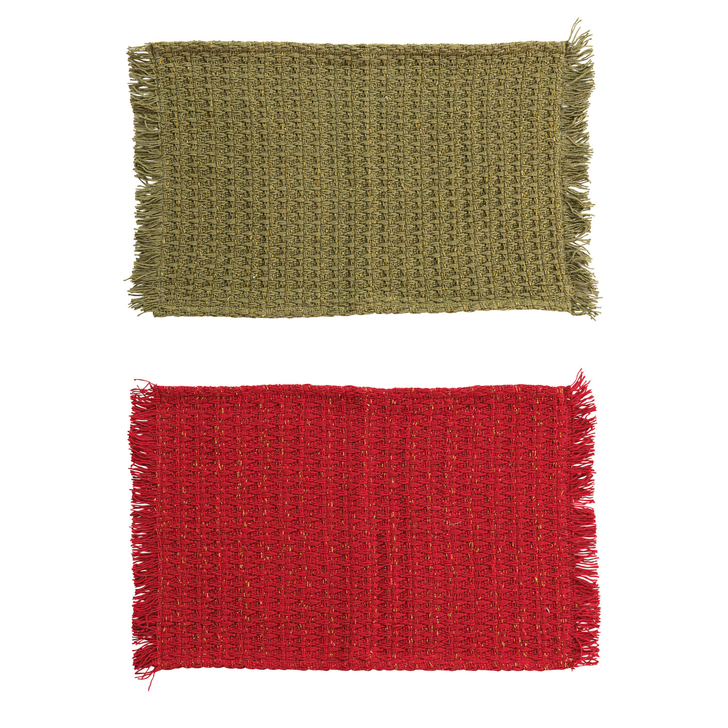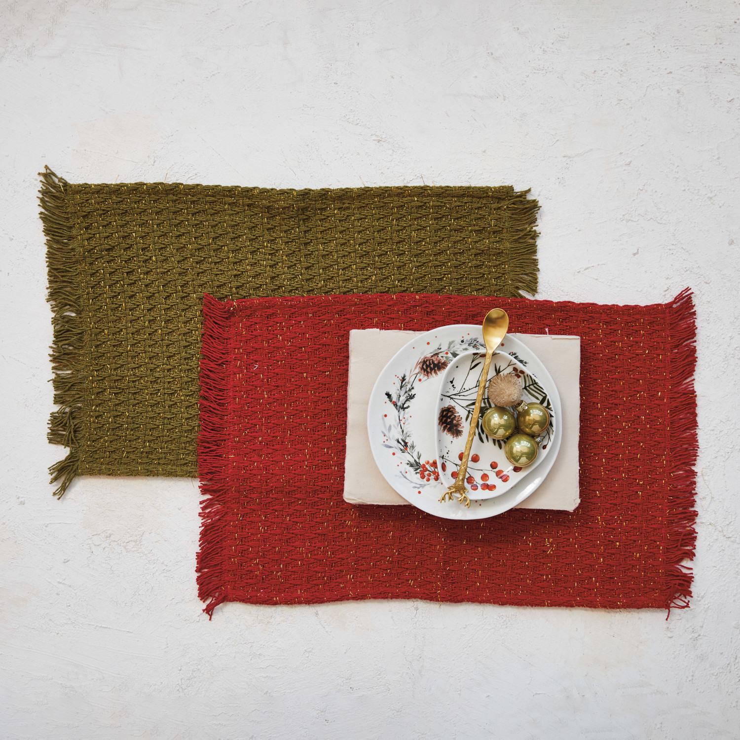 Add some sparkle and color to the table setting or holiday decor with these woven cotton placemats with metallic gold thread and fringe in green and red. These placemats feature a woven cotton fabric with metallic gold thread and fringe in green and red, giving them a festive and elegant look. These placemats are easy to clean and durable, and can be used for any occasion. Mix and match them with the existing tableware or other accessories. These placemats are made of cotton and lurex, and handcrafted with care. These placemats measure 19 inches in length, and 13 inches in width, and come in two different colors, green or red. A festive and elegant placemat that features a woven cotton fabric with metallic gold thread and fringe in green and red. A perfect choice for adding some sparkle and color to the table setting or holiday decor. These placemats are easy to clean and durable, and can be used for any occasion.