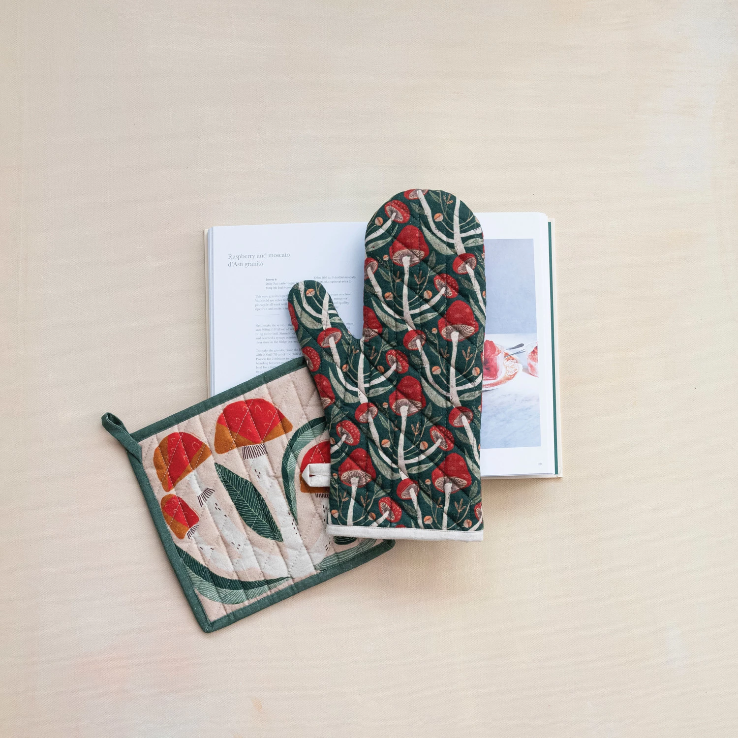 Add a dash of woodland charm to the kitchen accessories with this enchanting, quilted pot holder. The vibrant mushroom print set against a multicolor background evokes the magic of a forest floor, while the 8-inch square design provides practical coverage for busy cooks. Crafted from soft, durable cotton, it's designed to withstand the rigors of daily use while bringing a smile to every face. It measures 8 in width and 8 in length, offering ample space to protect hands from heat. Whether one is a gourmet chef or simply loves to infuse the home with whimsical details, this pot holder is sure to become a cherished part of every kitchen collection. A charming, quilted pot holder adorned with whimsical mushrooms, bringing a touch of the enchanted forest to the kitchen. A perfect accent for the nature-inspired kitchen, this pot holder blends functionality with a fairy-tale aesthetic. This pot holder is designed for safe handling of hot cookware, adding both protection and style to culinary endeavors.