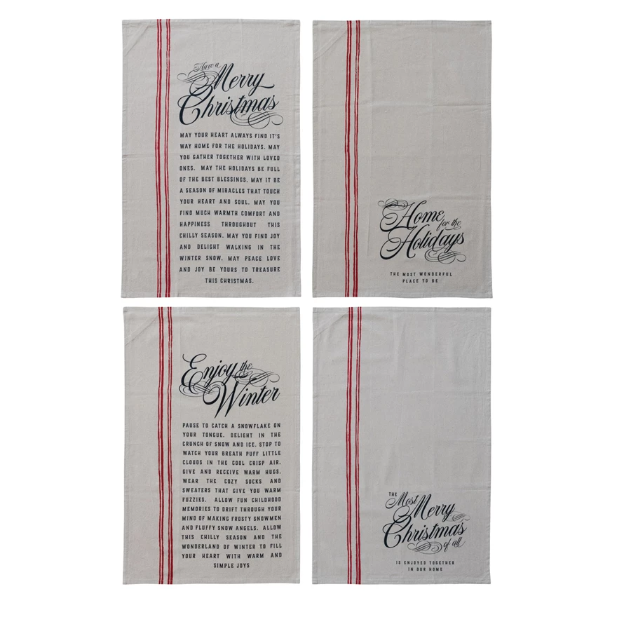 Catalog Name: 28"L x 18"W Printed Tea Towel w/ Stripes & Holiday Saying, Natural, Black & Red, 4 Styles ©