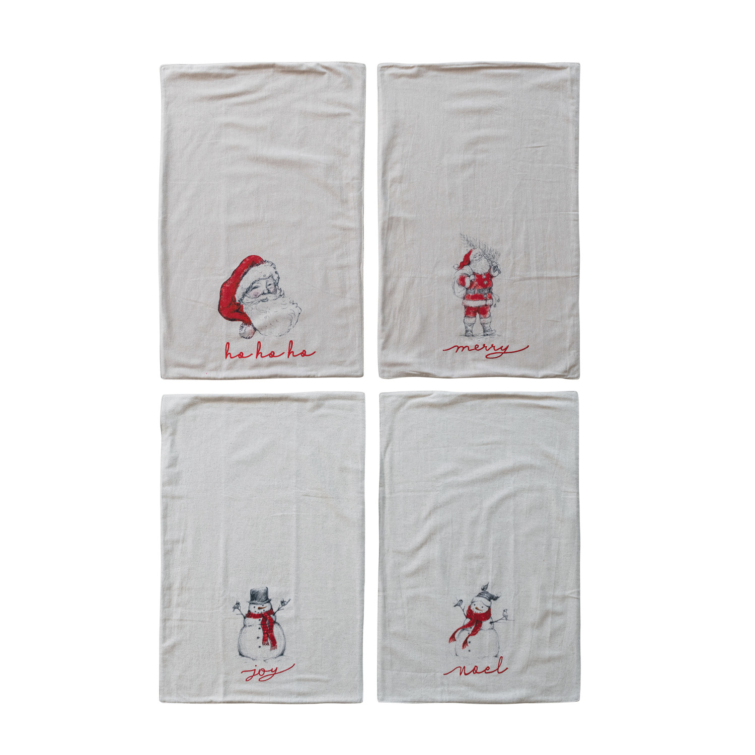 Catalog Name: 28"L x 18"W Cotton & Linen Printed Tea Towel w/ Snowman/Santa Image, Embroidered Holiday Word & Terry Cloth Back, Natural, Red & Black, 4 Styles ©
