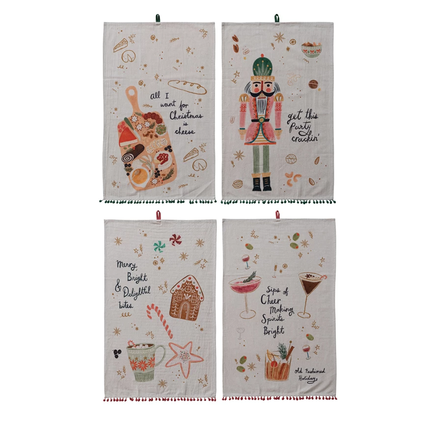 Tea Towel with Holiday Treats, Saying & Pom Pom Trim, 4 Styles ©