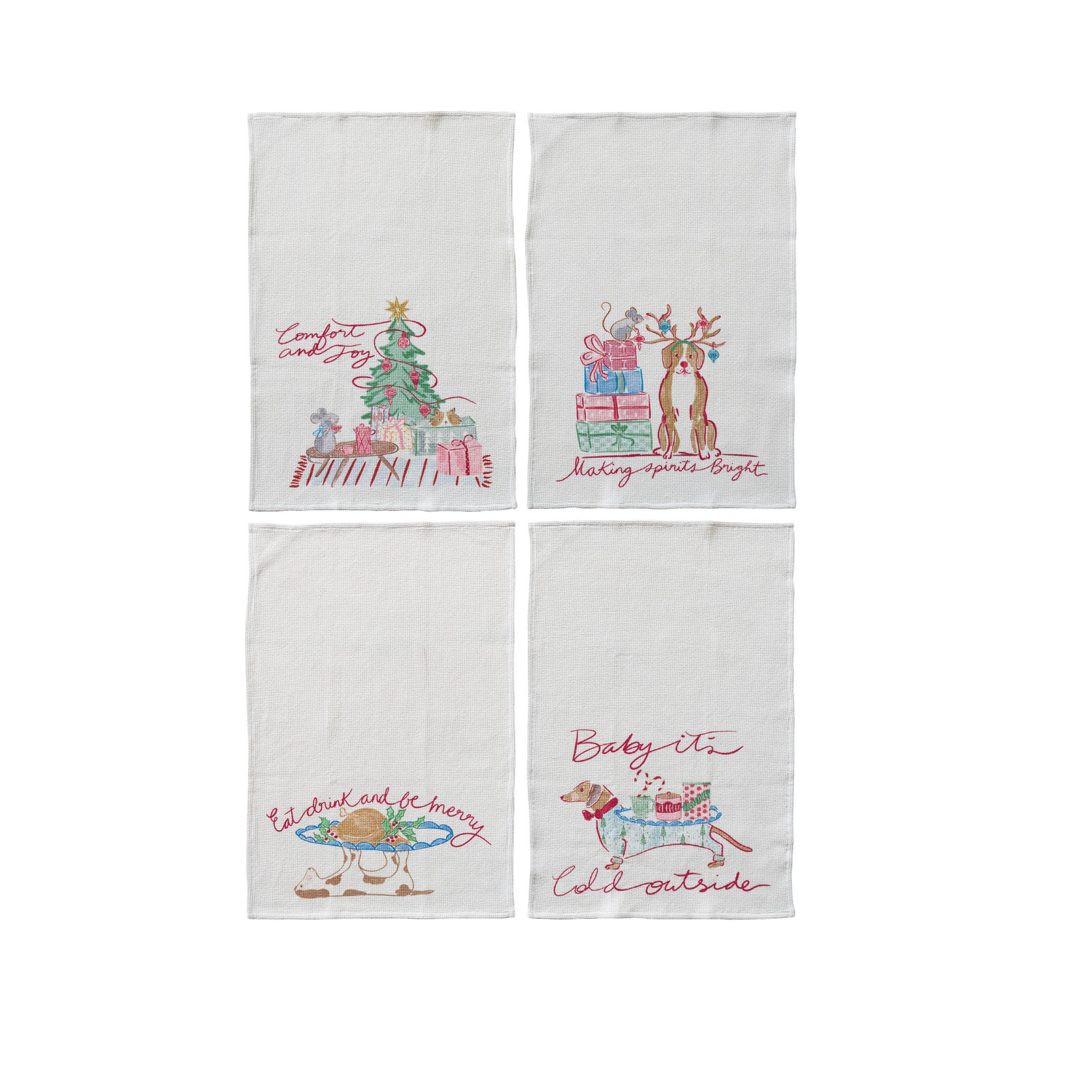 Waffle Weave Printed Tea Towel with Holiday Image & Saying, 4 Styles ©