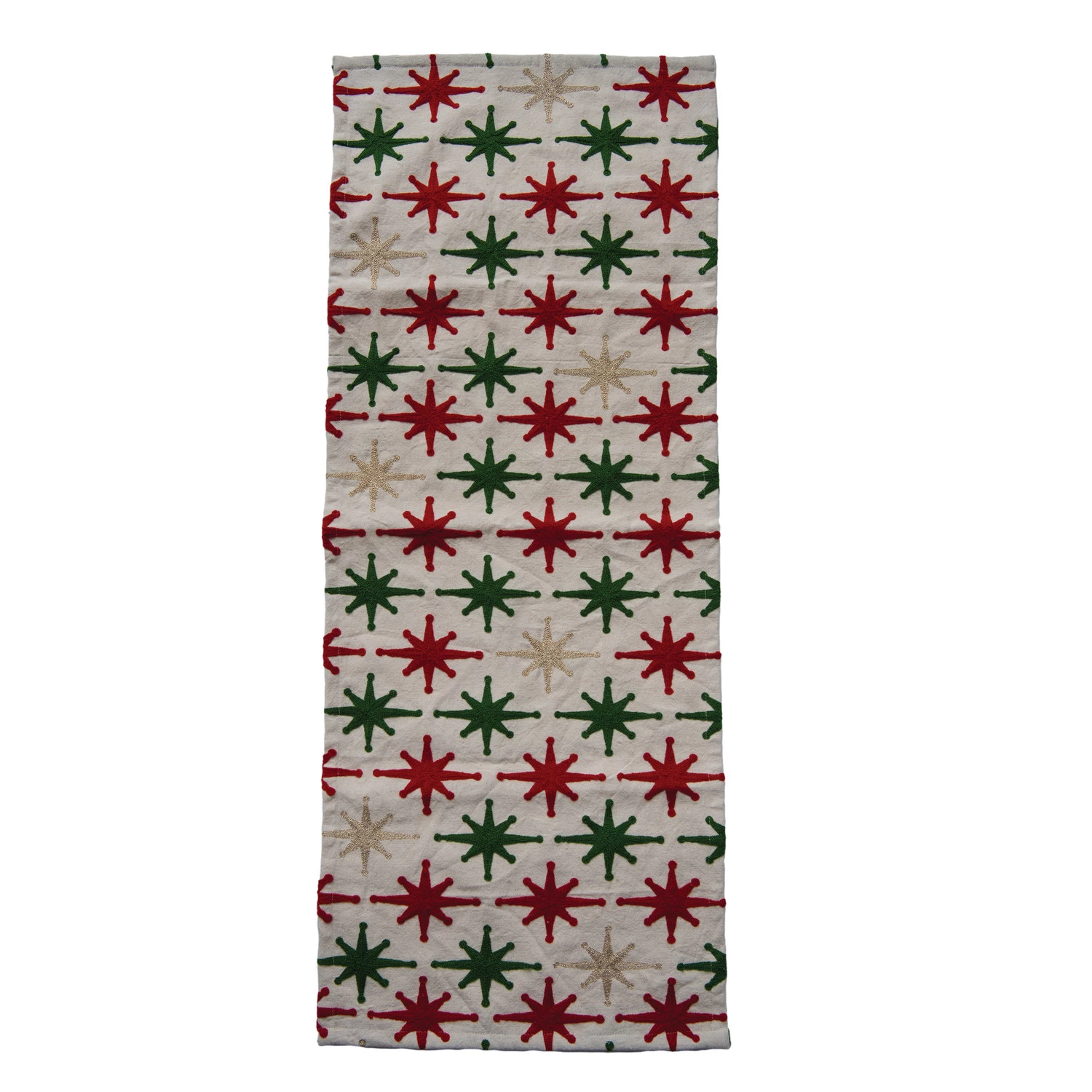 Catalog Name: 36"L x 14"W Table Runner w/ Embroidered Stars & Metallic Thread, Natural, Red & Green