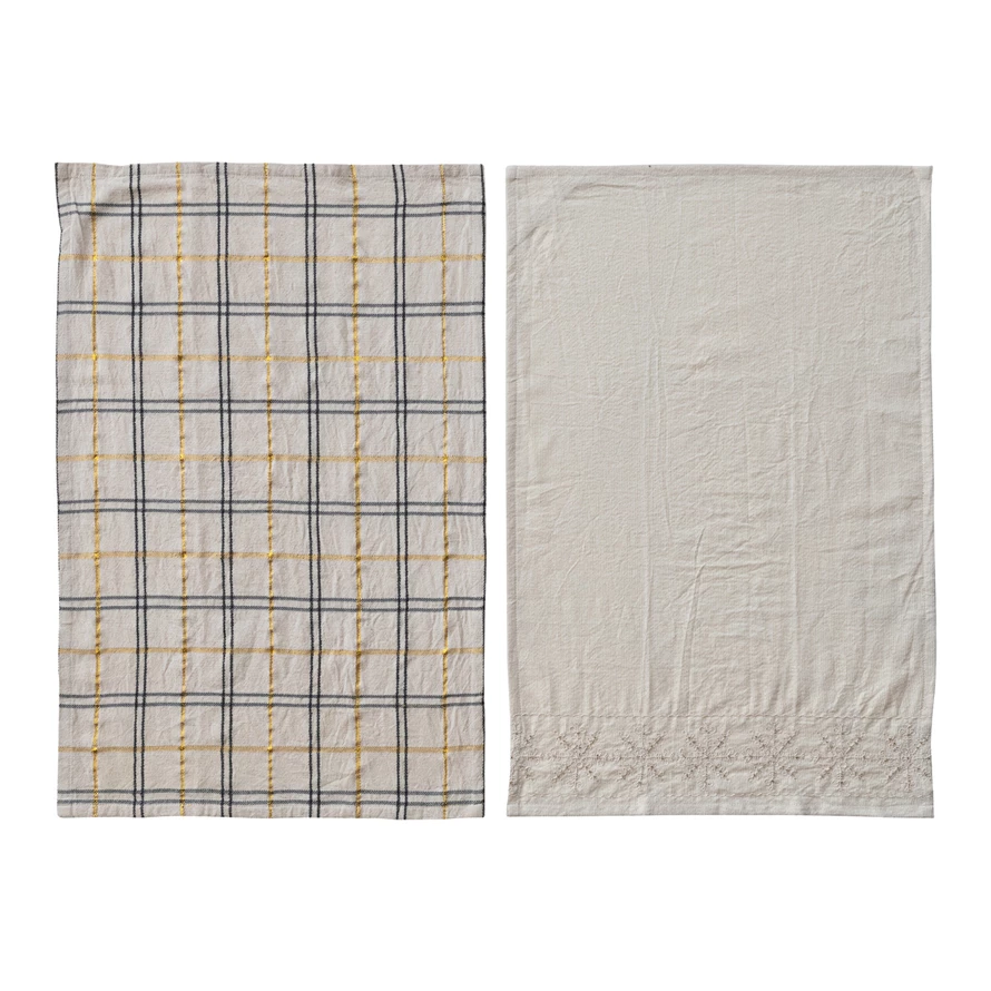 Catalog Name: 28"L x 18"W Woven Tea Towels w/ Metallic Thread Embroidery & Beads, Natural, Gold Color & Grey, Set of 2 Tied w/ Jute & Gift Tag