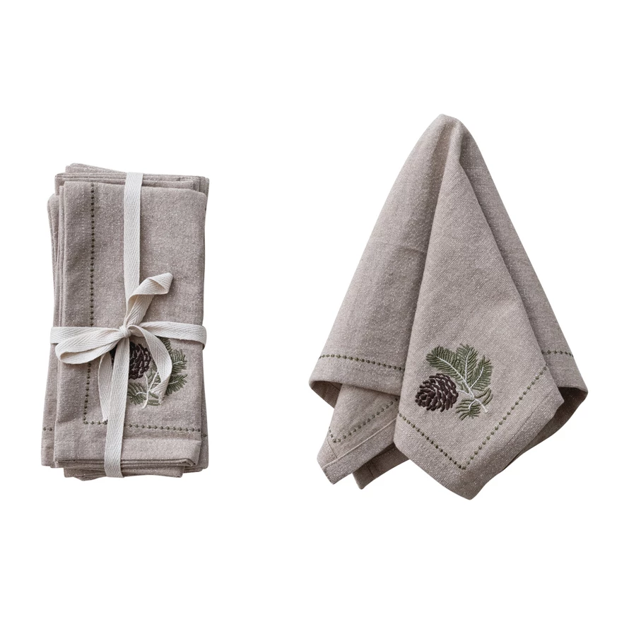 Catalog Name: 18" Square Napkins w/ Metallic Thread Embroidered Botanical & Border, Natural, Green & Brown, Set of 4 Tied w/ Tape