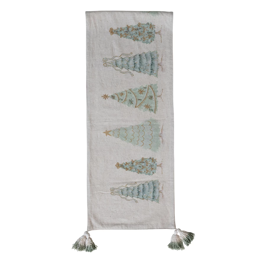 Catalog Name: 72"L x 14"W & Linen Printed Table Runner w/ Trees, Embroidery, Beads, French Knots & Tassels, Multi Color ©