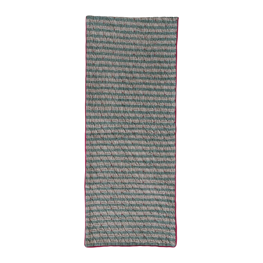 Catalog Name: 72"L x 14"W Woven Printed Smocked Striped Table Runner w/ Hand-Embroidered Beads & Velvet Piping, Green, Tan & Burgundy Color
