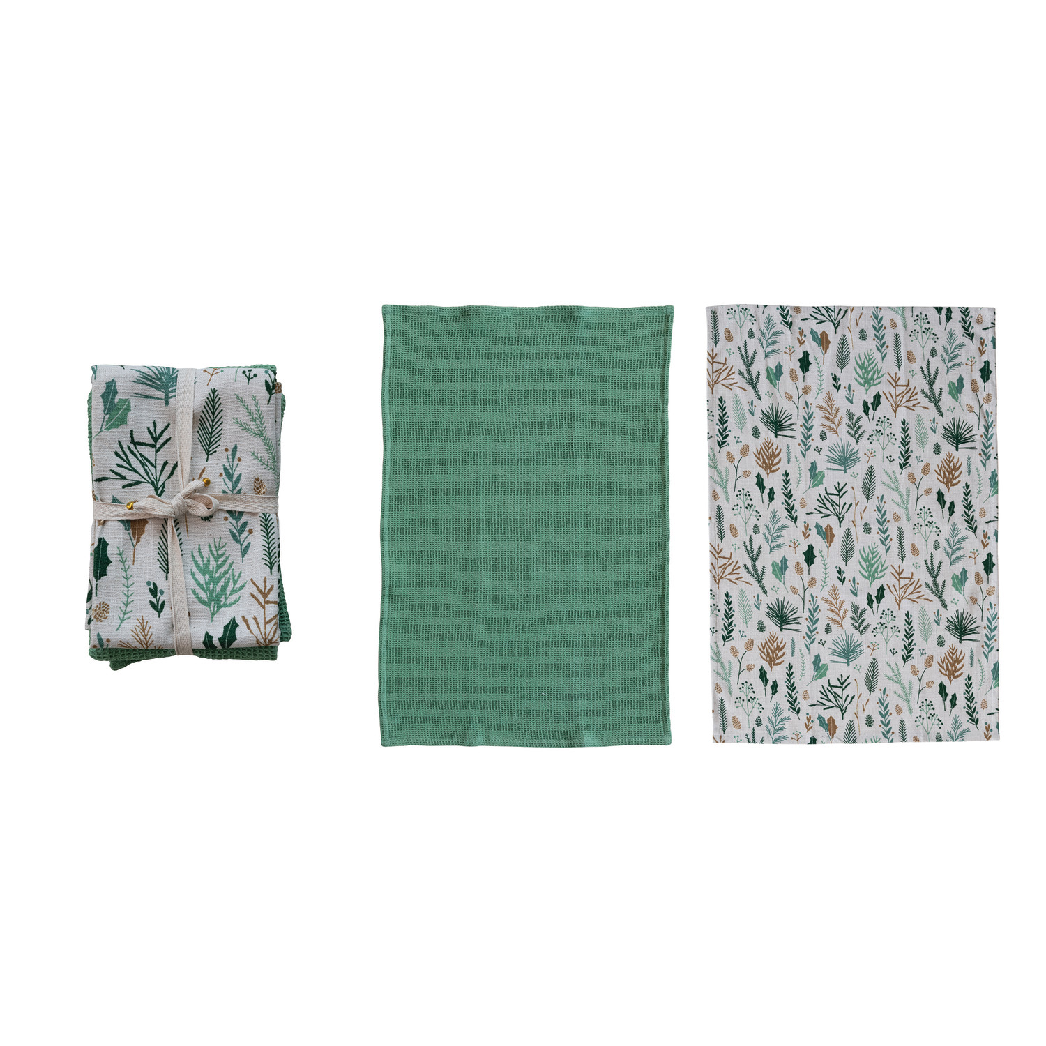 Woven Waffle Weave/Slub Tea Towel with Botanicals Pattern, Set of 2