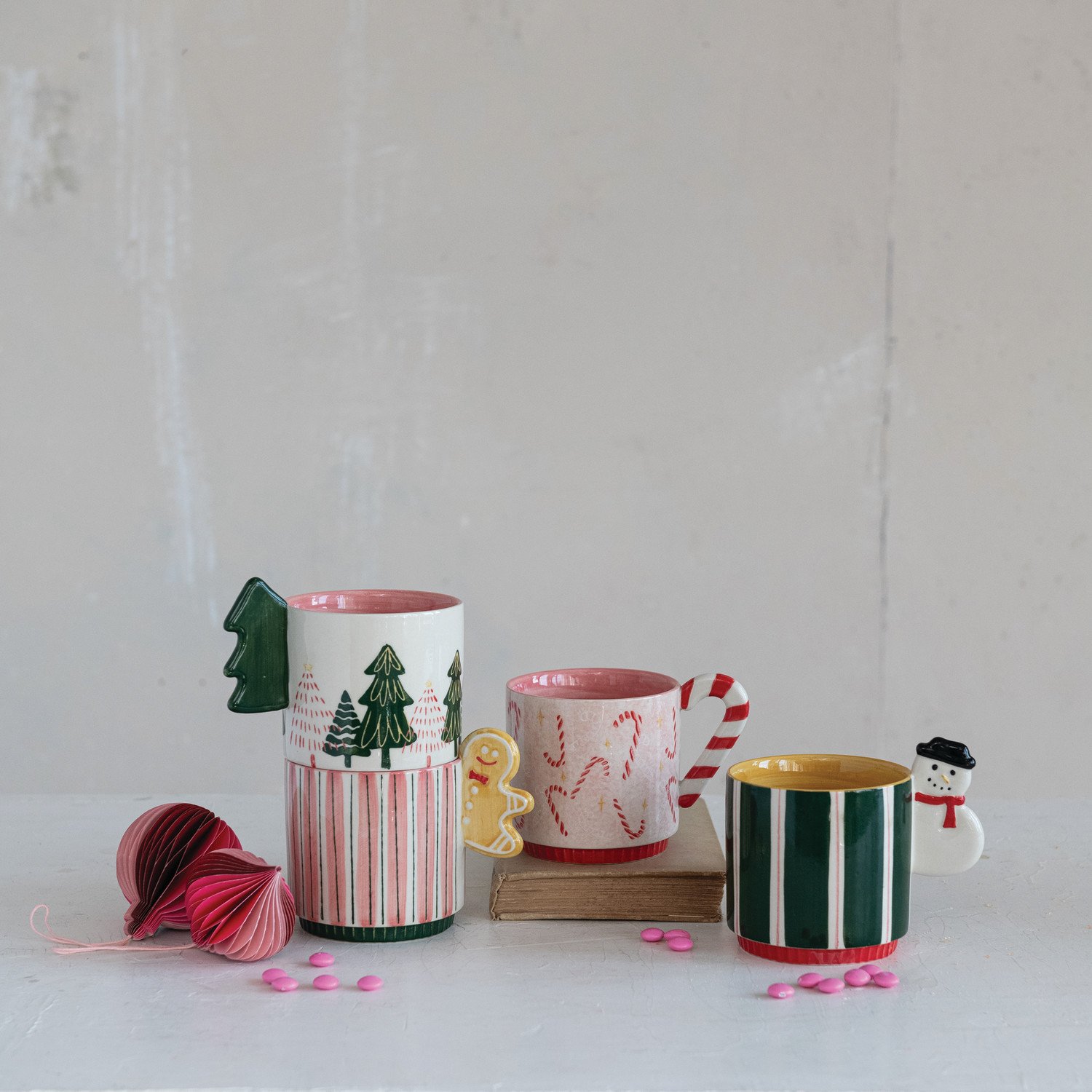 Catalog Name: 3-3/4" Round x 4-1/4"H 16 oz. Hand-Painted Stoneware Mug w/ Pattern & Holiday Icon Shaped Handle, Multi Color, 4 Styles