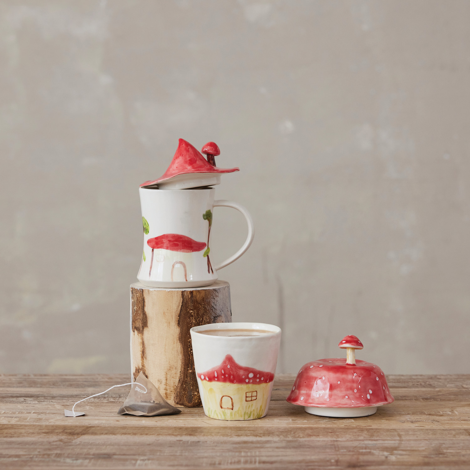 Catalog Name: 4" Round - 5-1/4" Round 8 oz. - 10 oz. Stoneware Mug w/ Image & Mushroom Shaped Lid, Multi Color, Set of 2, 2 Styles