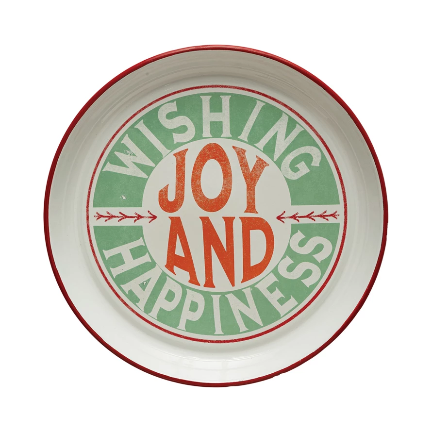 14-1/2" Round Enameled Tray with Red Rim "Wishing Joy And Happiness", Multi Color