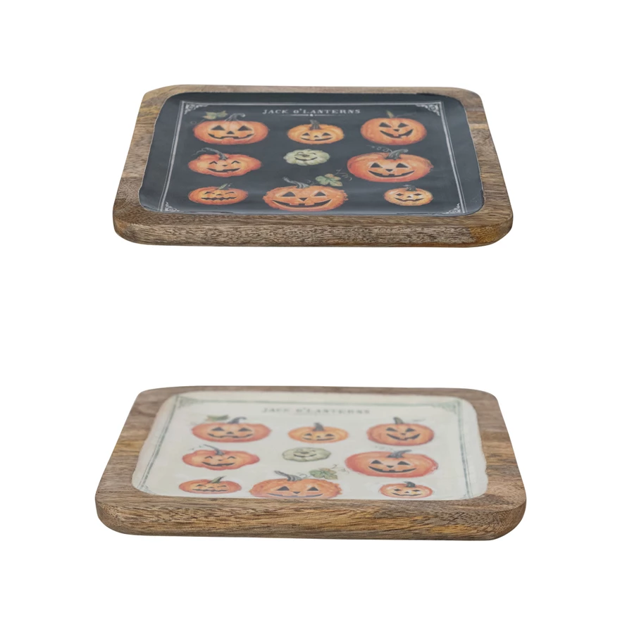 Catalog Name: 10" Square & 8" Square Enameled Mango Wood Trays w/ Jack-O-Lanterns, Multi Color, Set of 2 ©