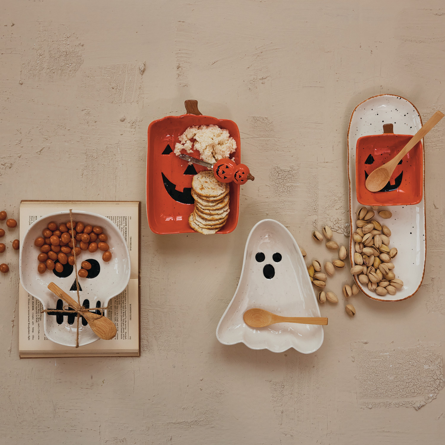Catalog Name: 12-1/2"L x 4-1/2"W Stoneware Dish w/ 4-3/4"L x 4"W Jack-O-Lantern Shaped Dish & Bamboo Spoon, Black, Orange & Cream Color, Boxed Set of 3 Tied w/ Jute
