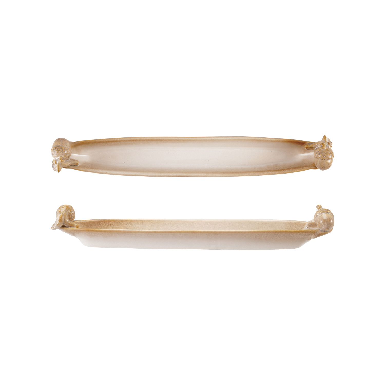 Catalog Name: 16-3/4"L x 2-1/2"W x 2-1/2"H Stoneware Olive Dish w/ 3D Acorns, Reactive Glaze, Cream Color (Each One Will Vary)