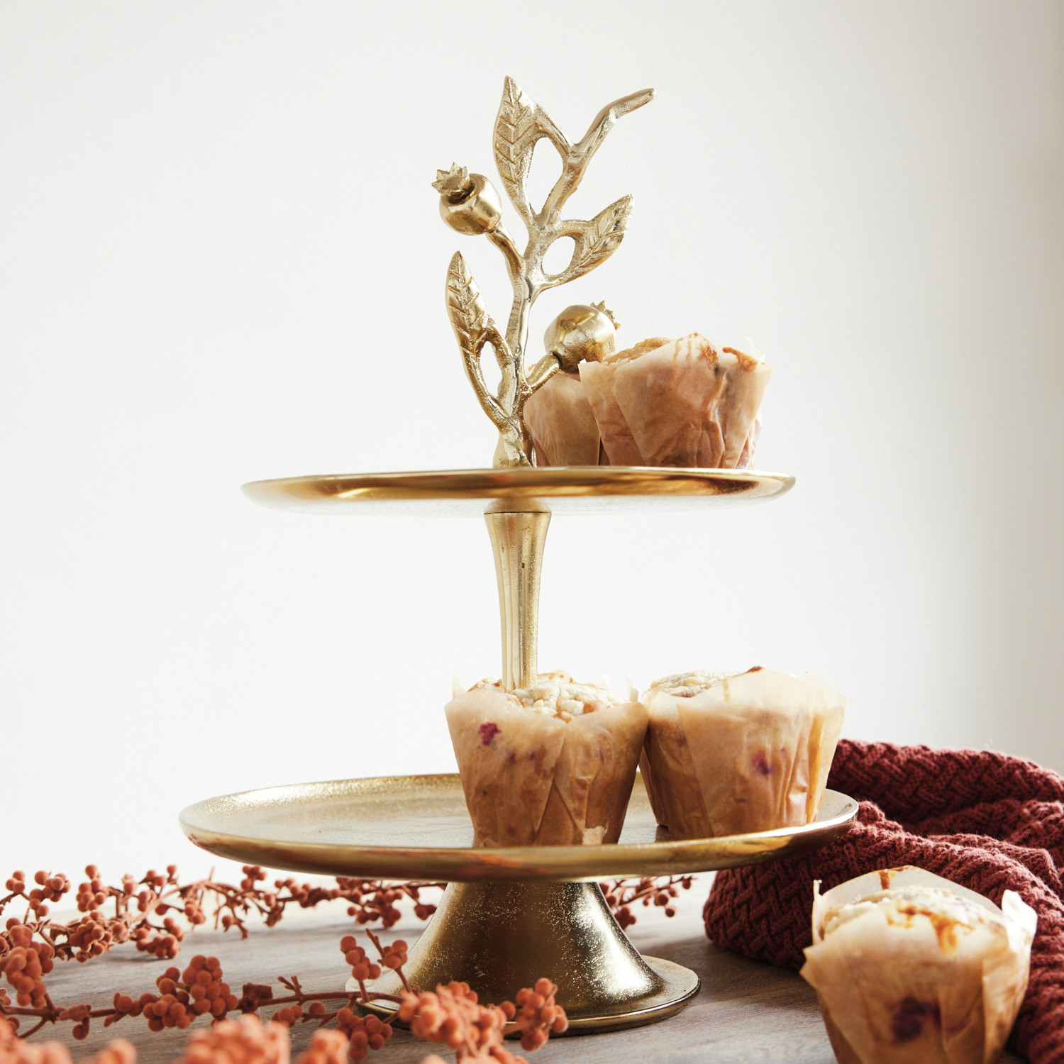 Cast Aluminum 2-Tier Tray with Pomegranate Branch Shaped Handle, Gold Finish, KD