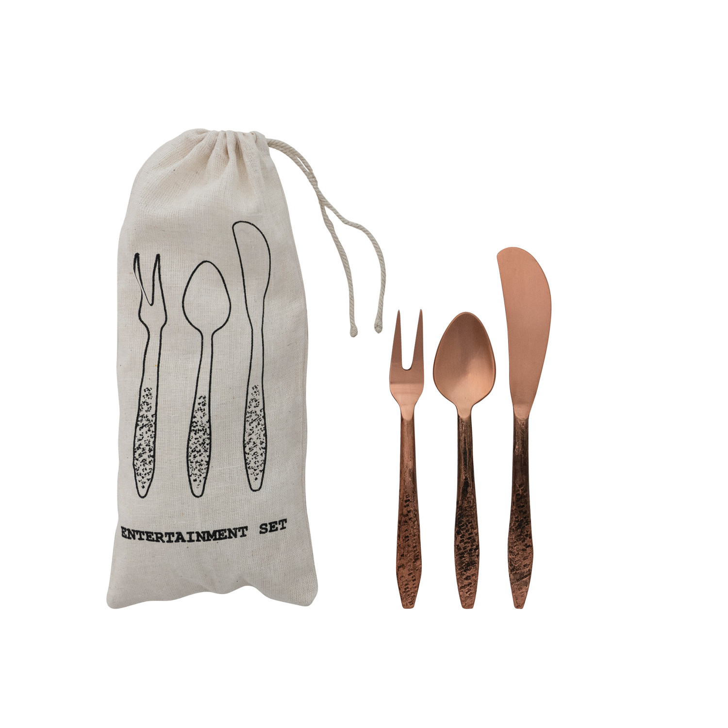 Catalog Name: 5-1/4"L - 6-1/2"L Stainless Steel Appetizer Utensils w/ Hammered Handles, Copper Finish, Set of 3 in Printed Drawstring Bag
