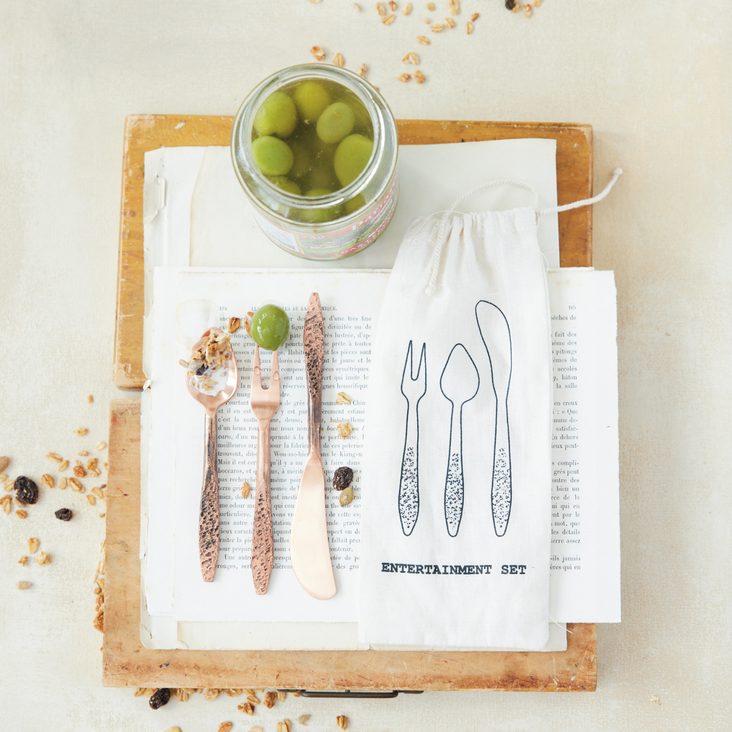 Stainless Steel Appetizer Utensils with Hammered Handles, Set of 3 in Drawstring Bag