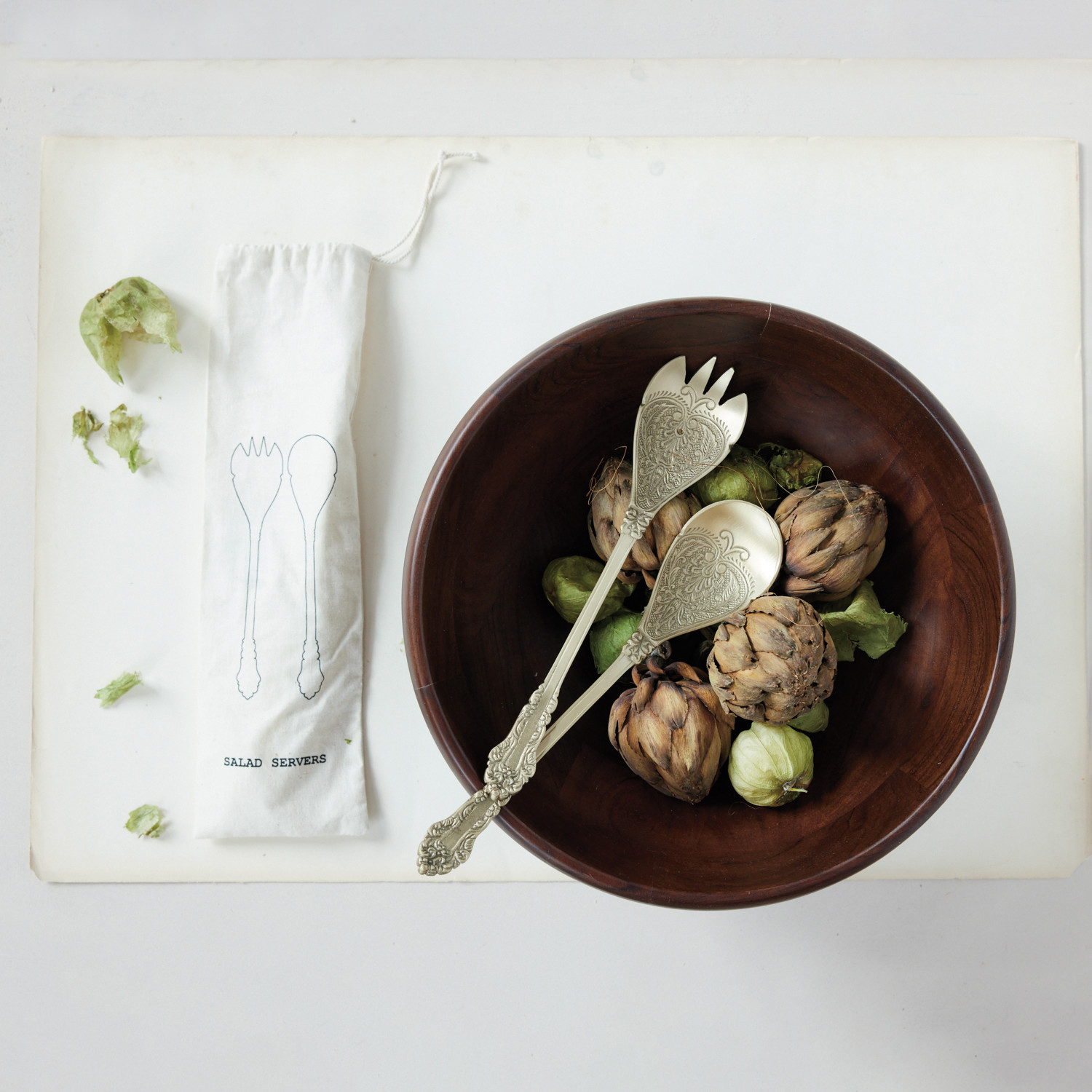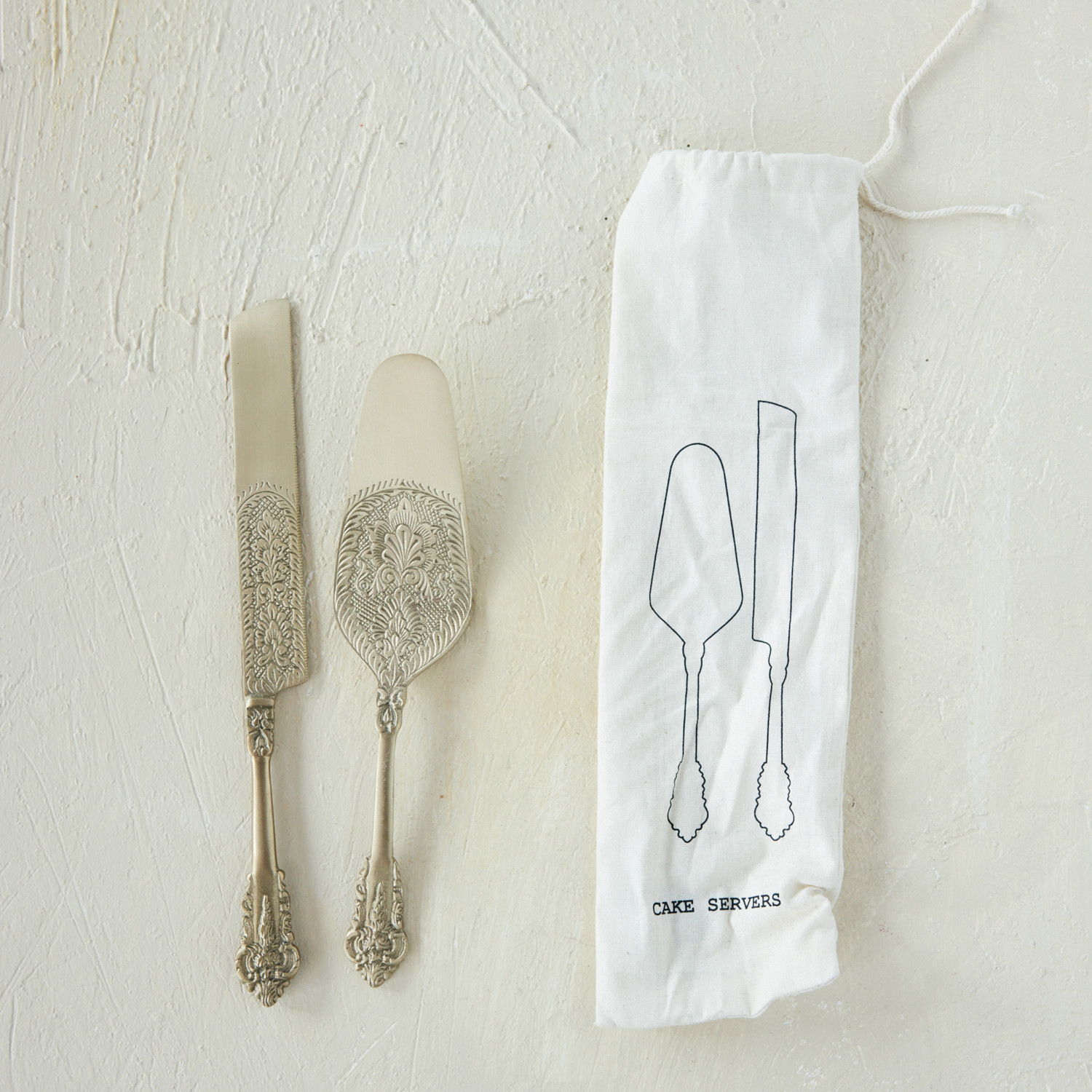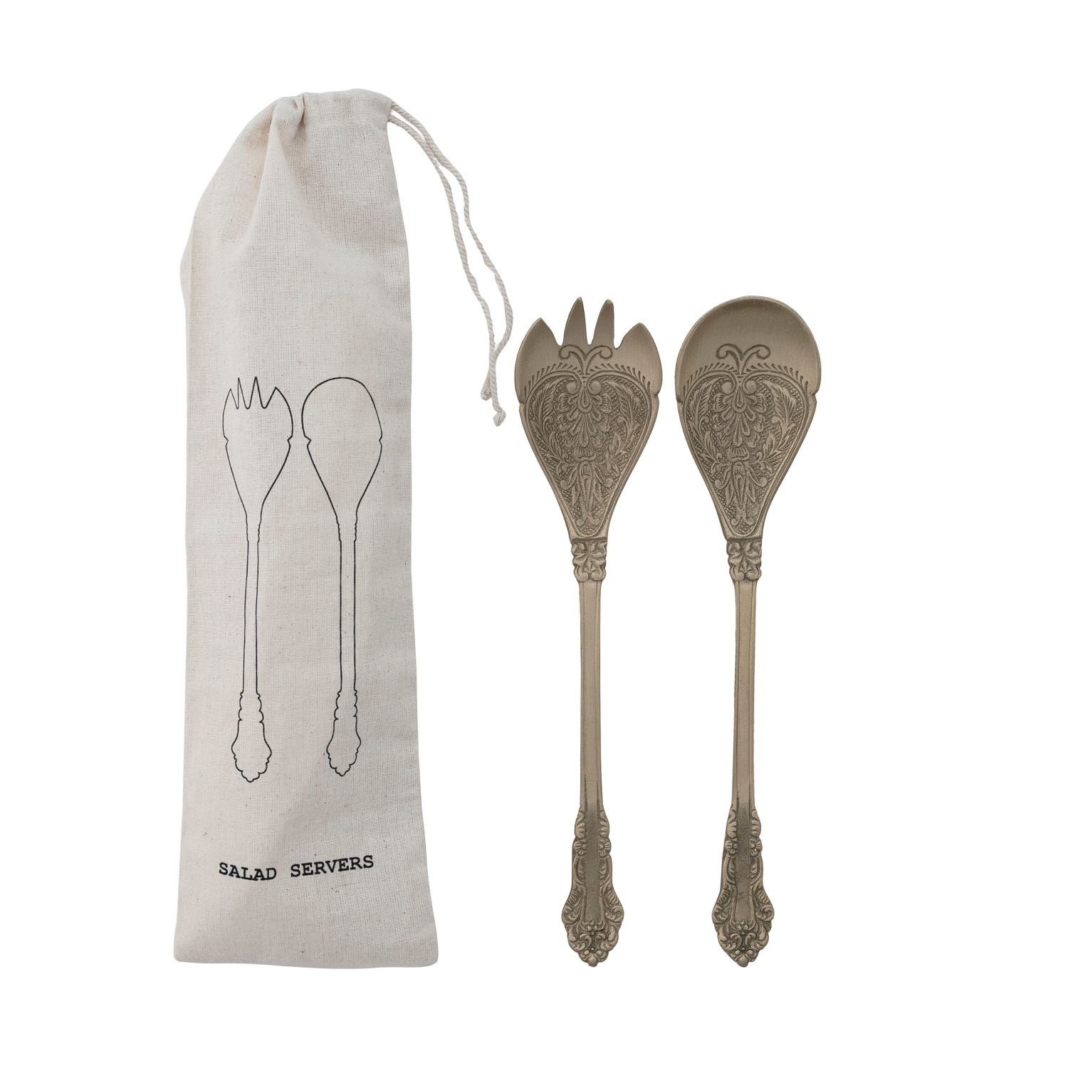 Embossed Brass Salad Servers, Set of 2 in Printed Drawstring Bag
