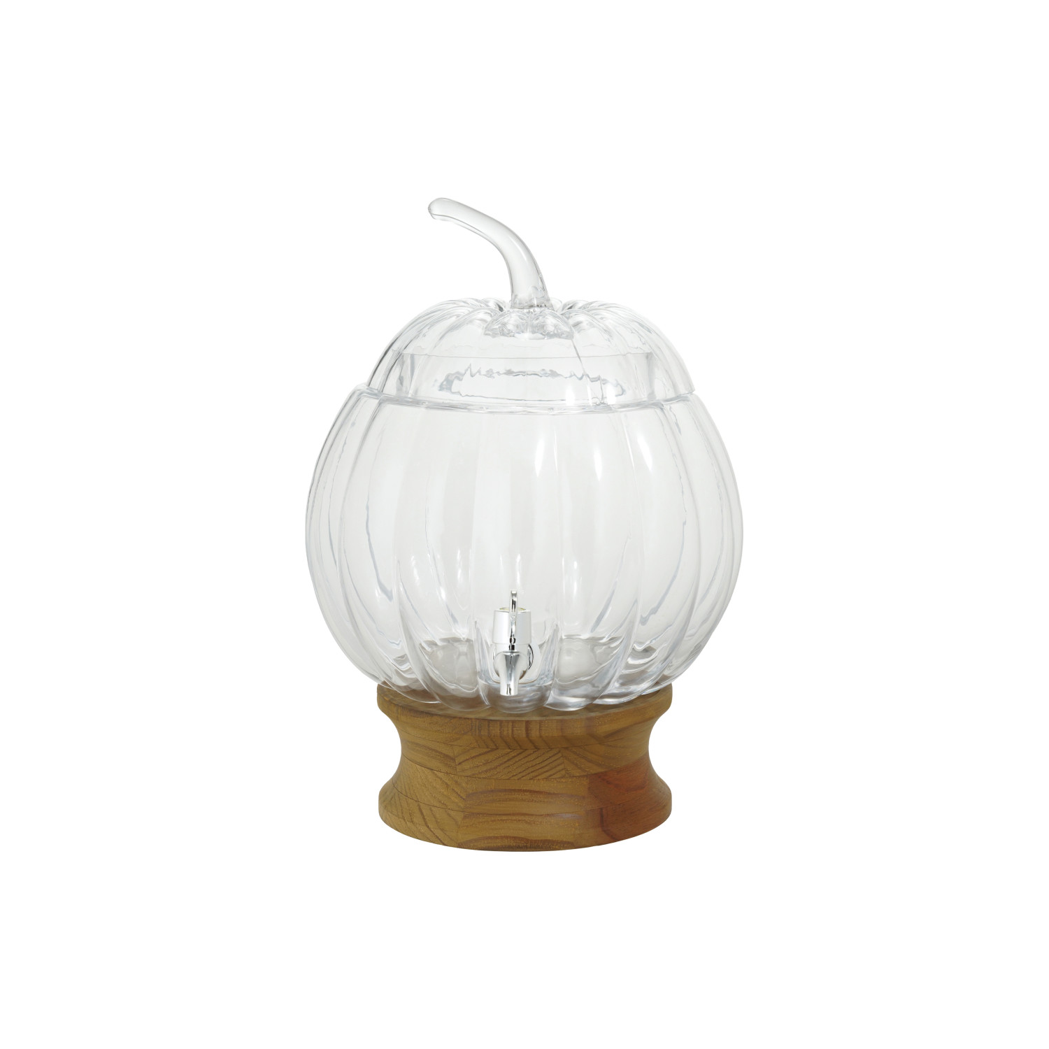 Catalog Name: 10-1/2" Round x 14-1/4"H 8-1/2 Quart Glass Pumpkin Shaped Beverage Dispenser w/ Stainless Steel Spout & Wood Stand, Natural, Set of 2