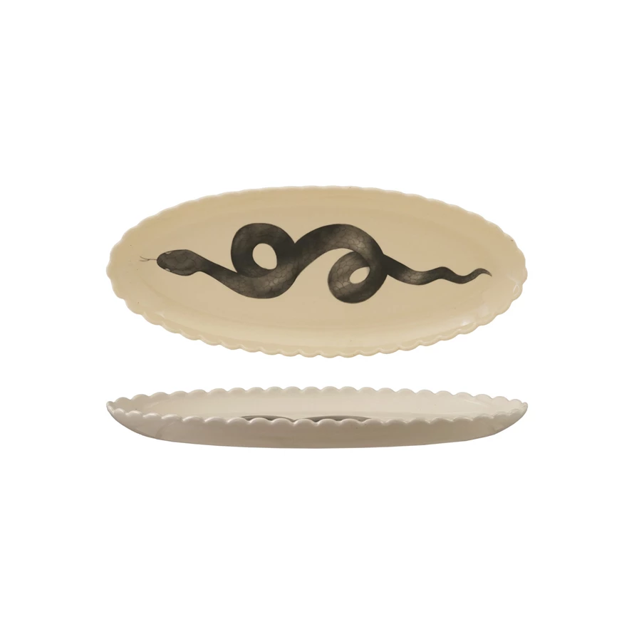 Catalog Name: 14"L x 5-3/4"W Oval Stoneware Scalloped Platter w/ Snake, White & Black
