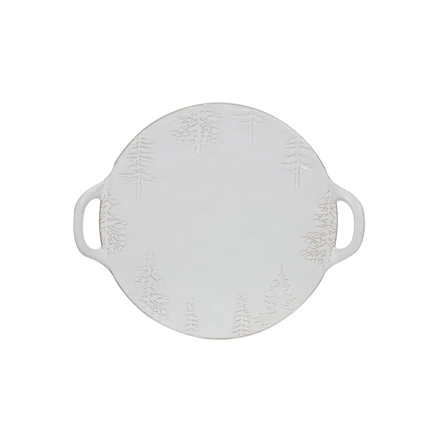 Catalog Name: 16"L x 13-1/4"W Debossed Stoneware Tray/Platter w/ Trees & Handles, Reactive Glaze, White (Each One Will Vary)