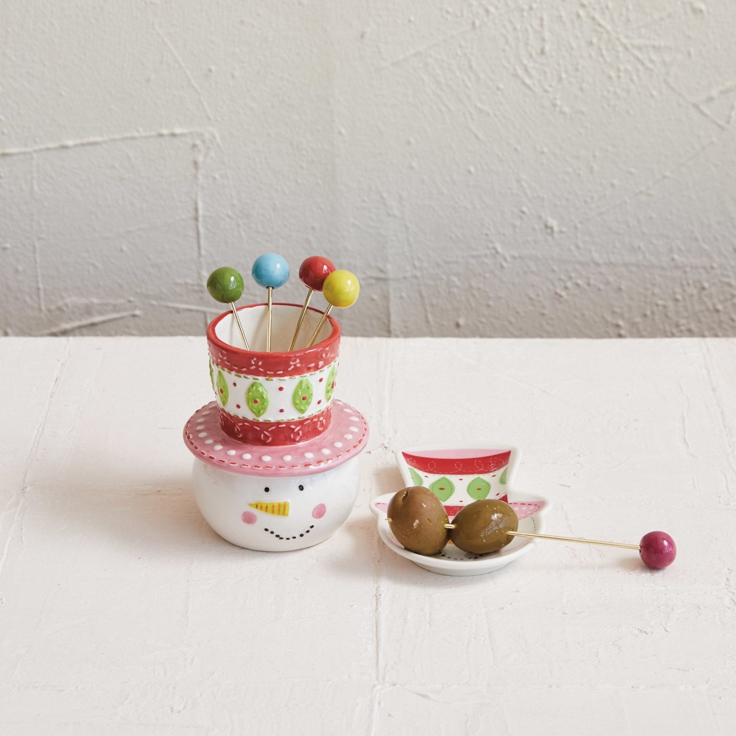Catalog Name: 3-1/2" Round x 4"H Ceramic Snowman Shaped Holder w/ (5) 5-1/4"L Appetizer Picks, Multi Color, Set of 6 ©