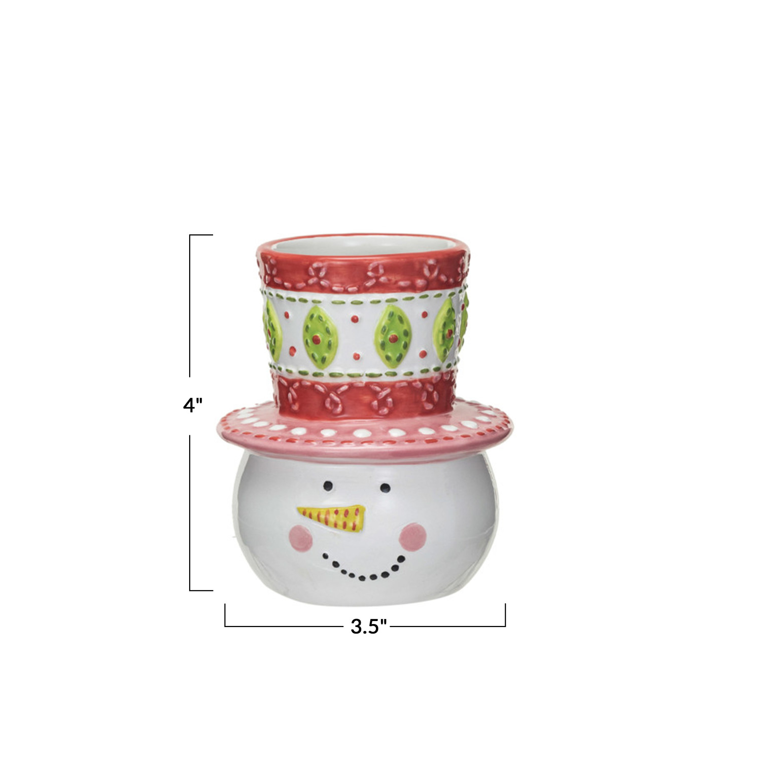 This ceramic holder and picks set features a snowman shape and a multicolor scheme that includes white, black, red, and green. The holder has a round and smooth shape that mimics a real snowman and a hole on the top for inserting the picks. The picks have metal stems and ceramic handles that match the holder. They are ideal for holding and serving appetizers, snacks, or fruits in a festive and fun way. The holder and picks are made of dolomite and metal, which are durable, easy to clean, and food-safe. They measure 3.5 inches in diameter, 4 inches in height for the holder, and 5.25 inches in length for each pick. This snowman-shaped ceramic holder and pick set will bring joy and style to the table. A ceramic holder with a snowman shape and five metal appetizer picks that add a touch of winter wonderland to the tableware. Perfect for holding and serving favorite appetizers, snacks, or fruits in a festive and fun way. The holder has a round and smooth shape that mimics a real snowman and a hole on the top for inserting the picks.