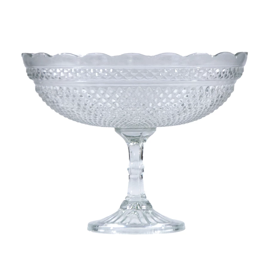 Catalog Name: 12" Round x 10-1/2"H Pressed Glass Scalloped Footed Bowl