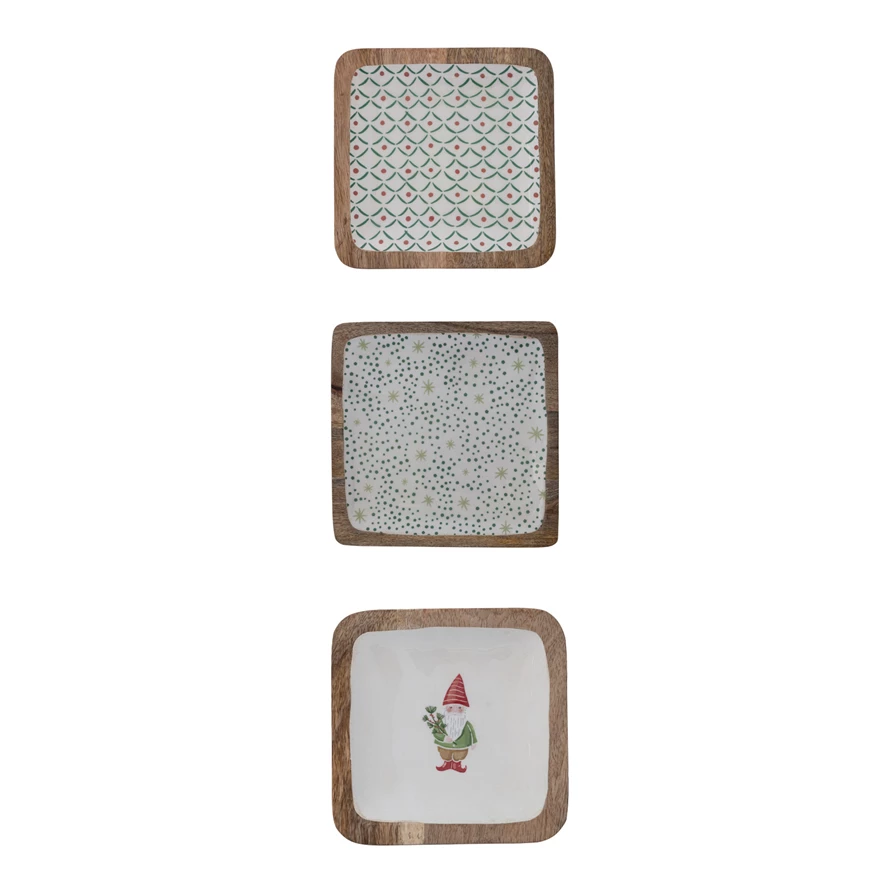 Catalog Name: 10" Square, 8" Square & 6-1/4" Square Enameled Mango Wood Trays w/ Patterns/Gnome, Multi Color, Set of 3 ©