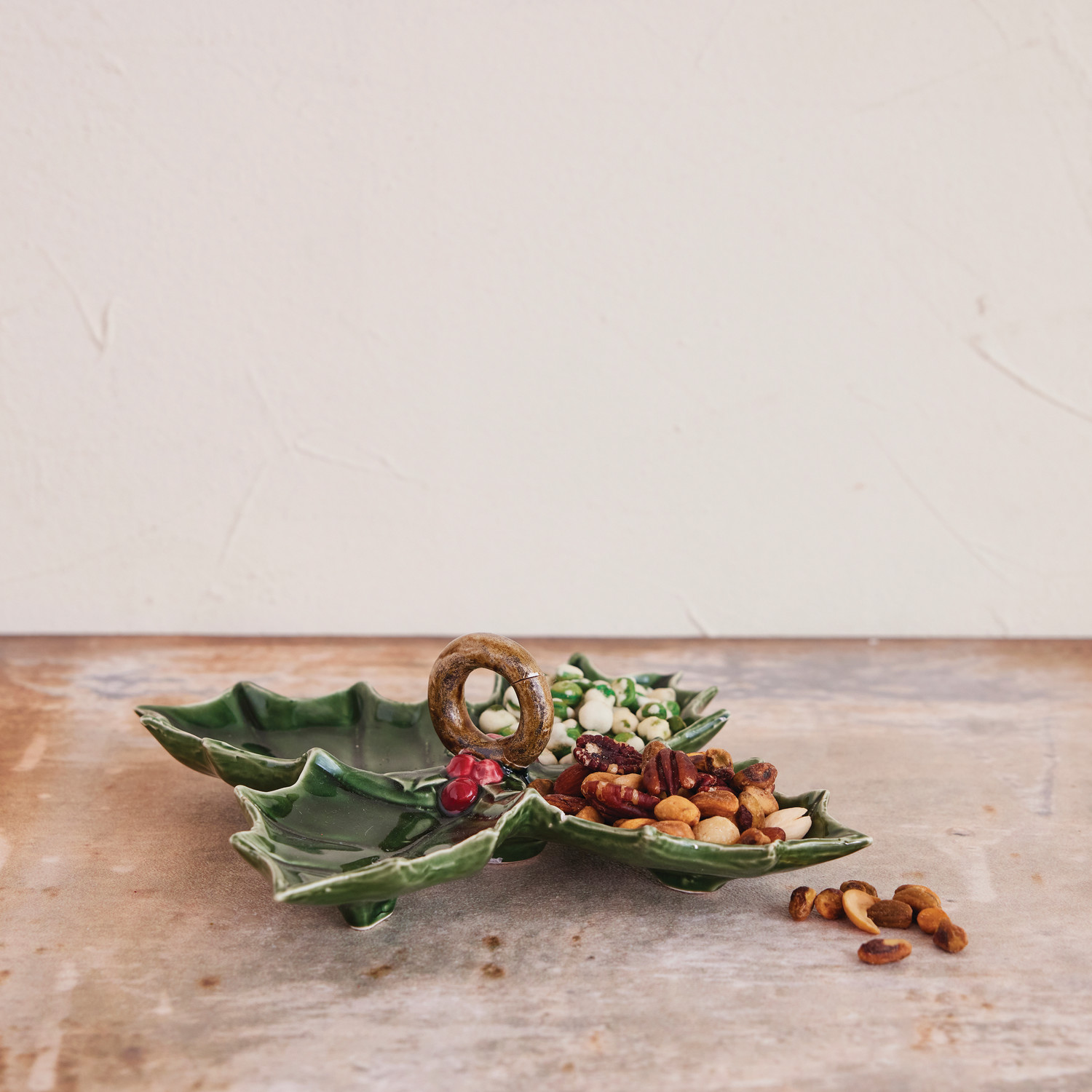 Ceramic Holly Leaf Shaped Dish with 4 Sections & Handle