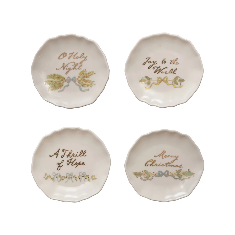 Catalog Name: 4" Round Stoneware Scalloped Plate w/ Holiday Saying & Gold Electroplating, Multi Color, 4 Styles ©