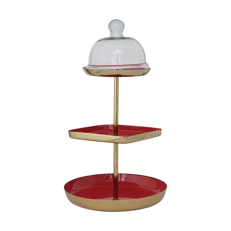 Catalog Name: 8-1/2" Round x 15-1/4"H Enameled Metal 3-Tier Tray w/ 5-1/4" Round x 4-1/4"H Glass Cloche, Red & Gold Finish, Set of 2, KD