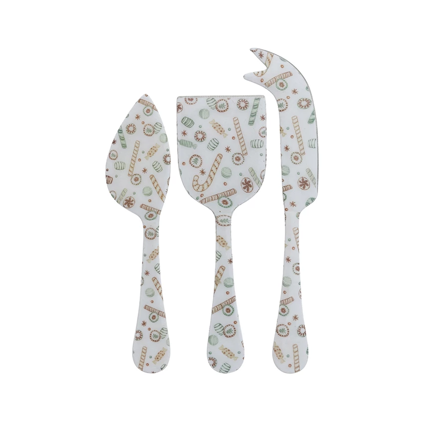 Catalog Name: 6"L - 7"L Enameled Stainless Steel Cheese Knives w/ Holiday Candy Pattern, Multi Color, Set of 3 ©